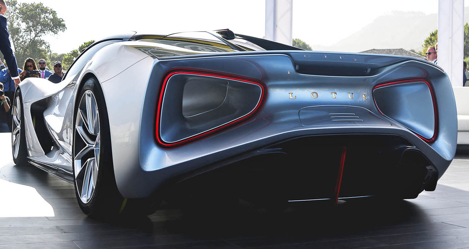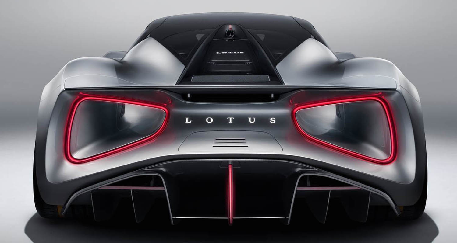 The directional indicators are incorporated into the corners of the ribbon, while the reversing light is provided by the illuminated ‘T’ of the ‘LOTUS’ wordmark above the integrated charging flap.