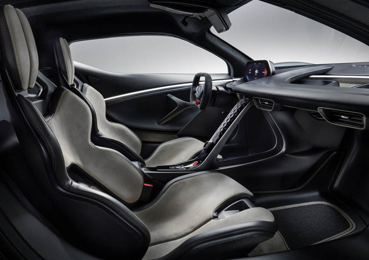 Inside, the cabin strikes the perfect balance between the precise functionality of a track car and the comfort of a road car. The driving position is fully adjustable to accommodate the greatest range of occupants. The elegant carbon fibre shell seats are hand-trimmed with thick Alcantara-finished pads, and feature manual fore / aft adjustment plus electric back operation. The steering column is manually adjustable for both rake and reach. Three-point seatbelts are fitted as standard, with four-point harnesses an option. Built into the bodyshell, close to the occupants’ hip point, are two bespoke storage areas.