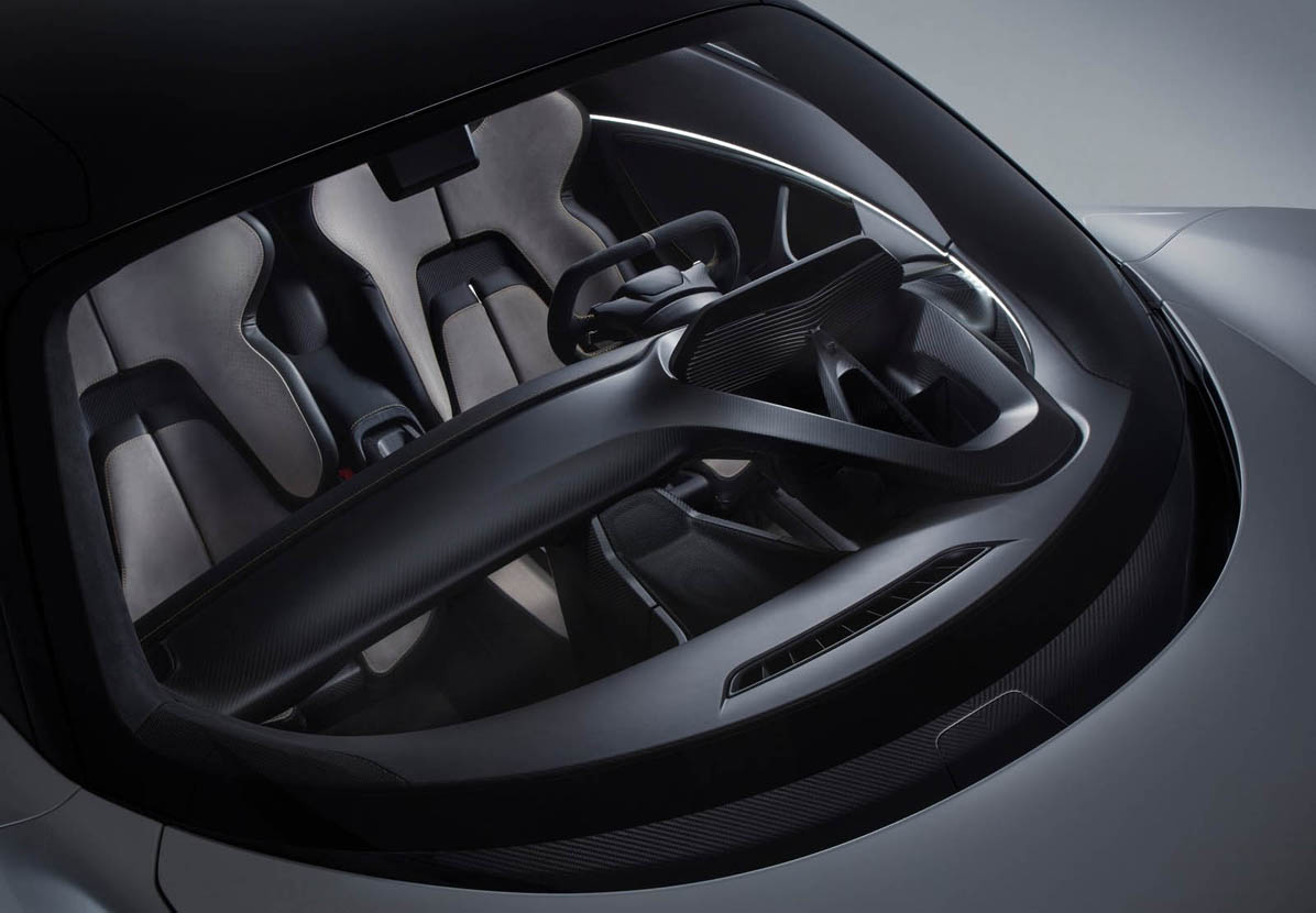 The battery pack is mounted centrally behind the passenger compartment, and its cover is visible through the glass rear screen. This positioning delivers significant advantages in terms of styling, aerodynamics, packaging, weight distribution, occupant comfort and dynamic handling. It also supports fast and convenient servicing and maintenance. Furthermore, the set-up has been designed so that in the future alternative battery packs – for example, to optimise track performance – can be easily installed.