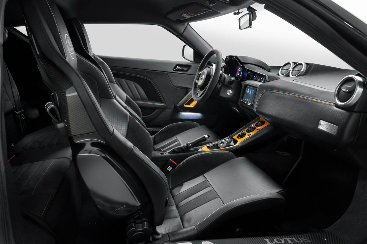 With all the lightweight options fitted, mass is further reduced to 3,104 lbs (1,408 kg). This gives a total weight saving of 71 lbs (32 kg) when compared to the Evora 400.