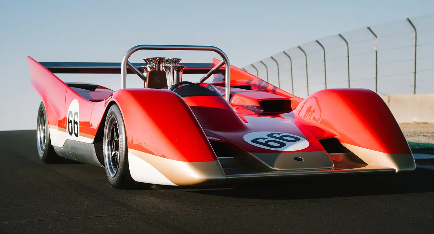 At the heart of the Type 66 is a period-representative V8 push-rod engine. It’s mid-mounted for optimised handling, tuned by Lotus to produce more than 830bhp at 8,800rpm*. Bespoke modern-day components include an aluminium forged crank, rod and pistons, which generate torque of more than 746 Nm at 7,400rpm*. The iconic Can-Am-inspired air intake ‘trumpets’ take centre stage at the top of the engine. These not only smooth out the air intake to create laminar flow, but also greatly improve the volumetric efficiency, allowing for greater combustion and more power.