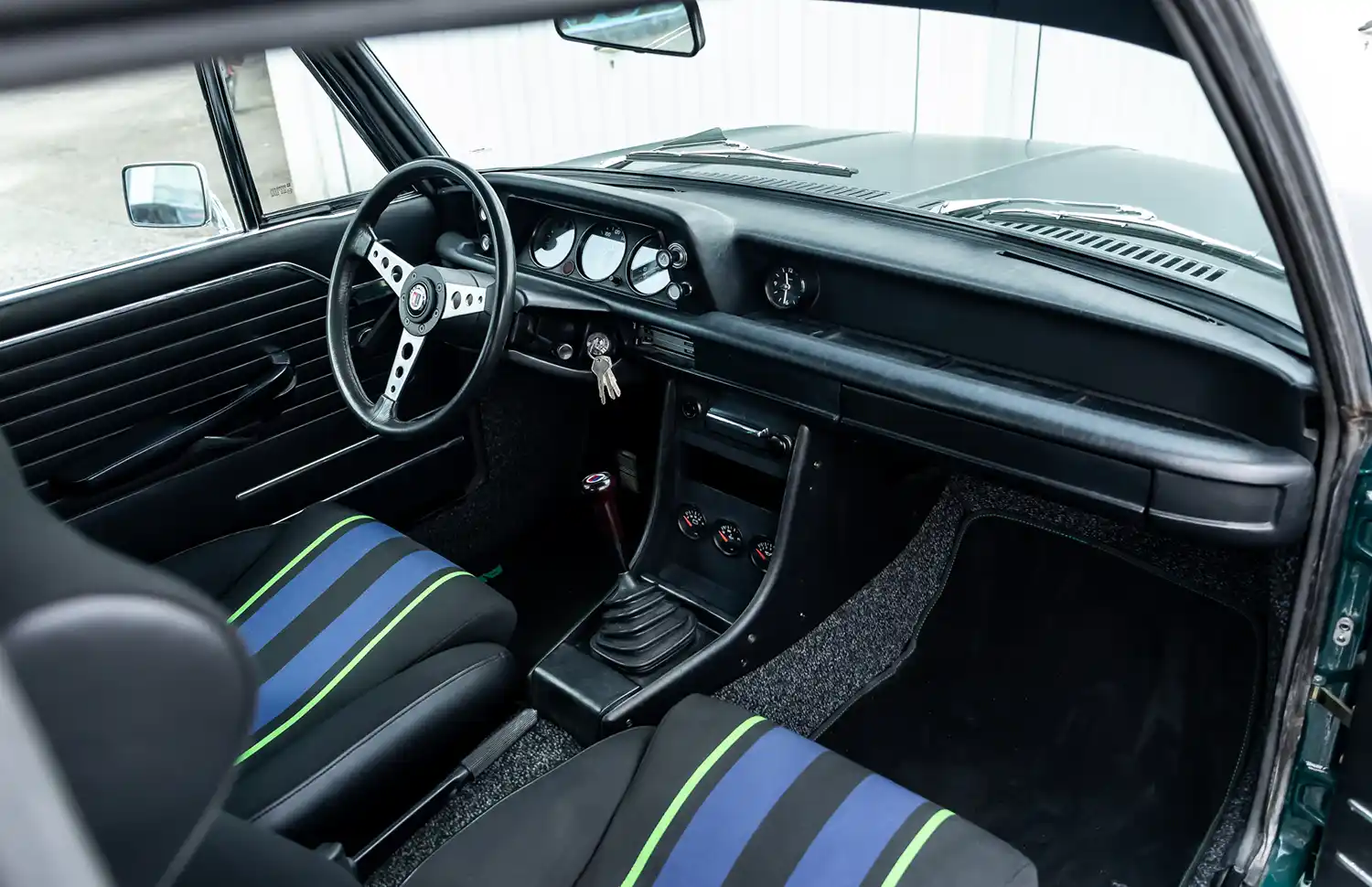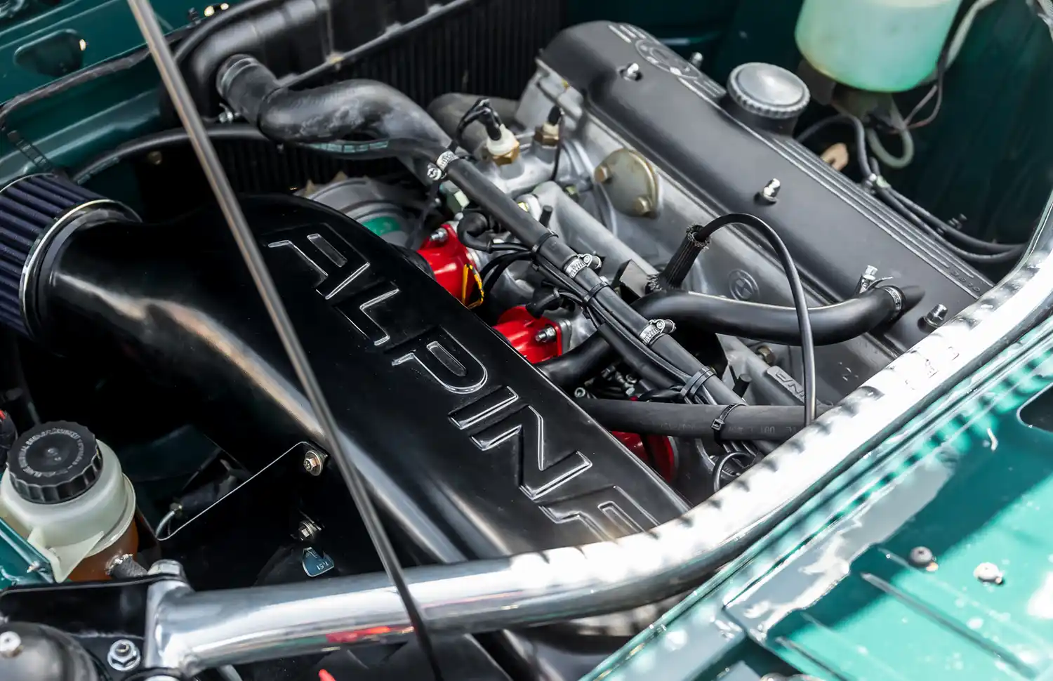 Accordingly, the two-litre M10 in-line four-cylinder engine in the ALPINA A4 variant is found in the front of the sporty two-door. It features a single throttle system and a manifold from ALPINA. Also thanks to the supplementary installation of a K&N airbox, the engine is significantly more powerful than in the “normal” BMW 2002 tii, stock (130 hp / 178 Nm). 200 hp and 215 Nm are listed in the data sheet of the power unit, which has been completely overhauled and refurbished by MANHART Classic Cars – plenty of power for an oldie from the 1960s weighing just about one ton. The fact that the BMW expresses this power even more acoustically is thanks to the newly installed MANHART exhaust system.