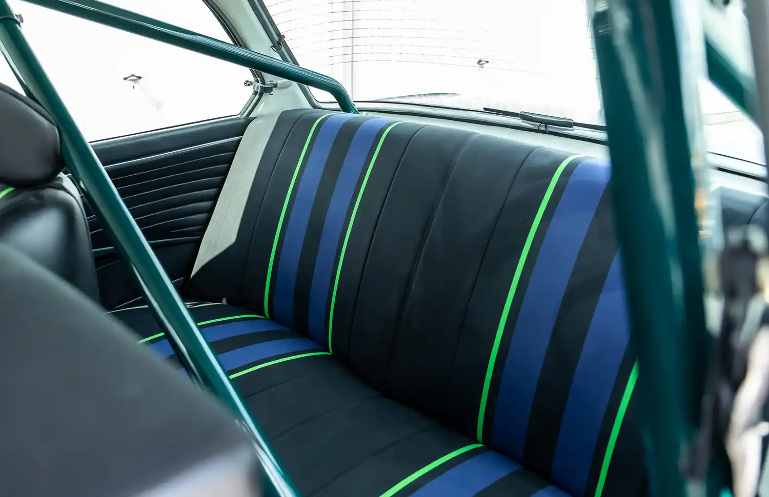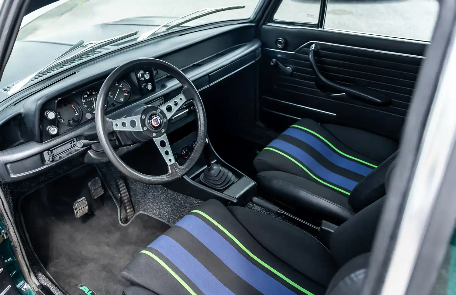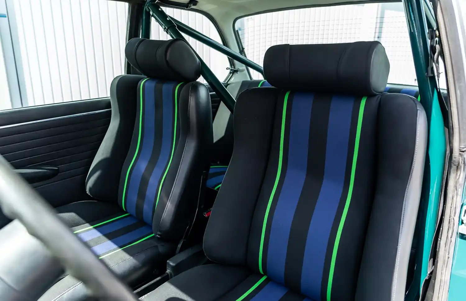 Another visual highlight are the decorative stripes and lettering of the characteristic ALPINA decal set. It extends in light green and silver over the body, which is painted in the BMW colour Agave Green. The bright green of the accent lines on the body is also found in the interior: the seats have stripes in this colour as well as in blue. The driver and co-pilot sit in sports seats by Scheel, which have been prepared by MANHART Classic Cars. The rear is rounded off by a Clubsport roll bar.