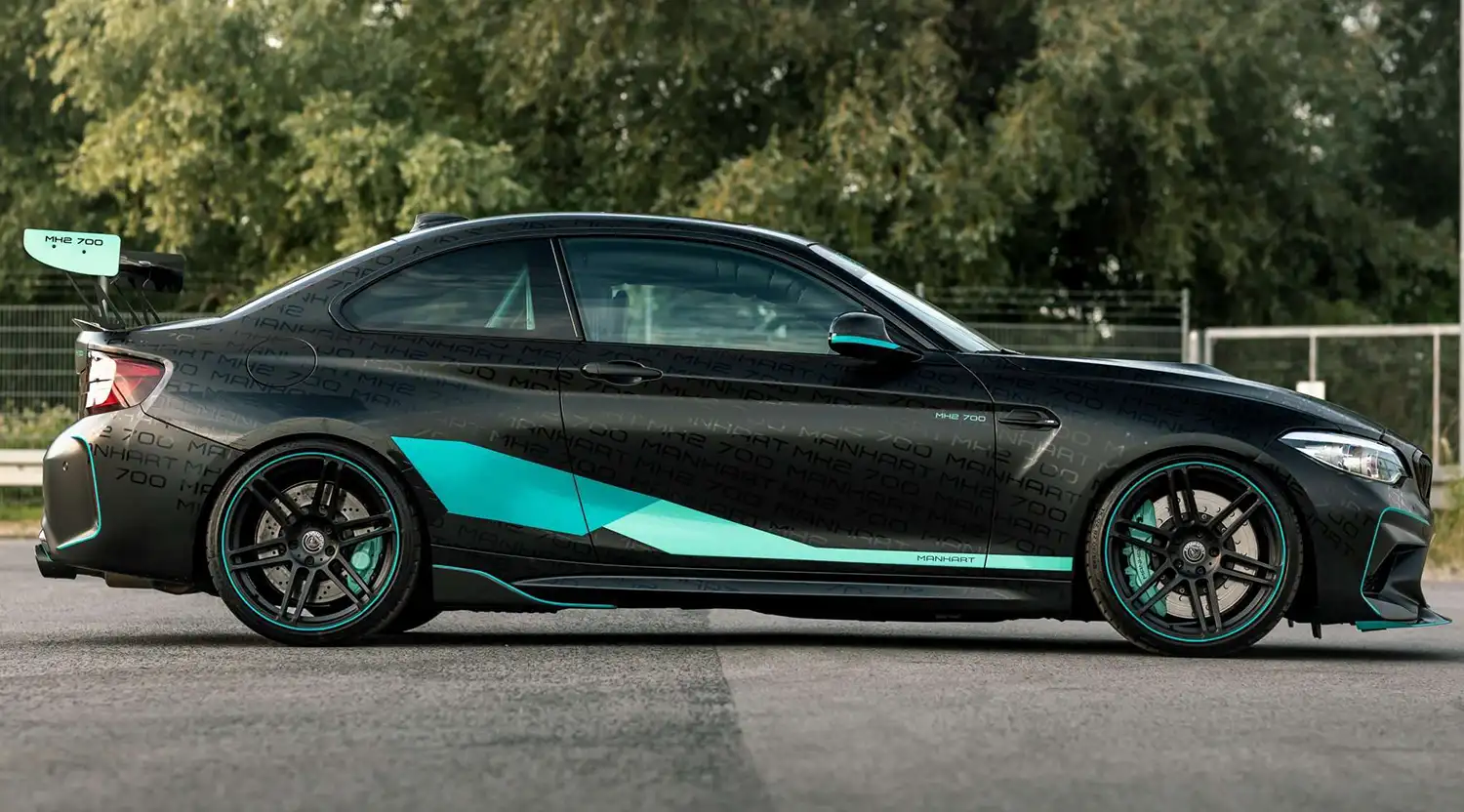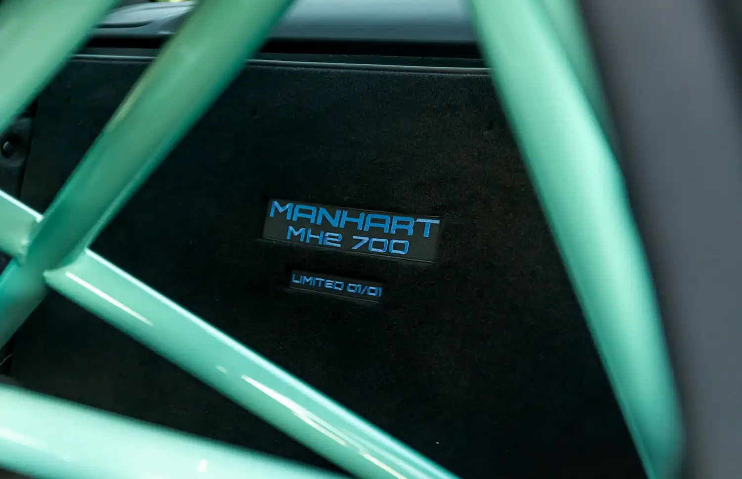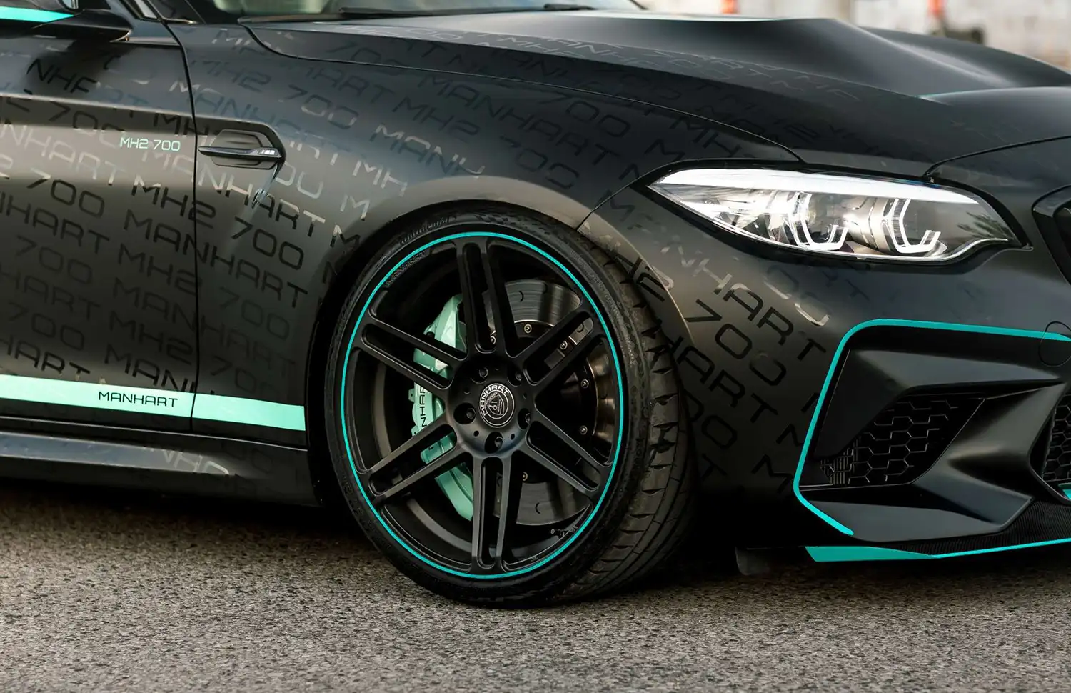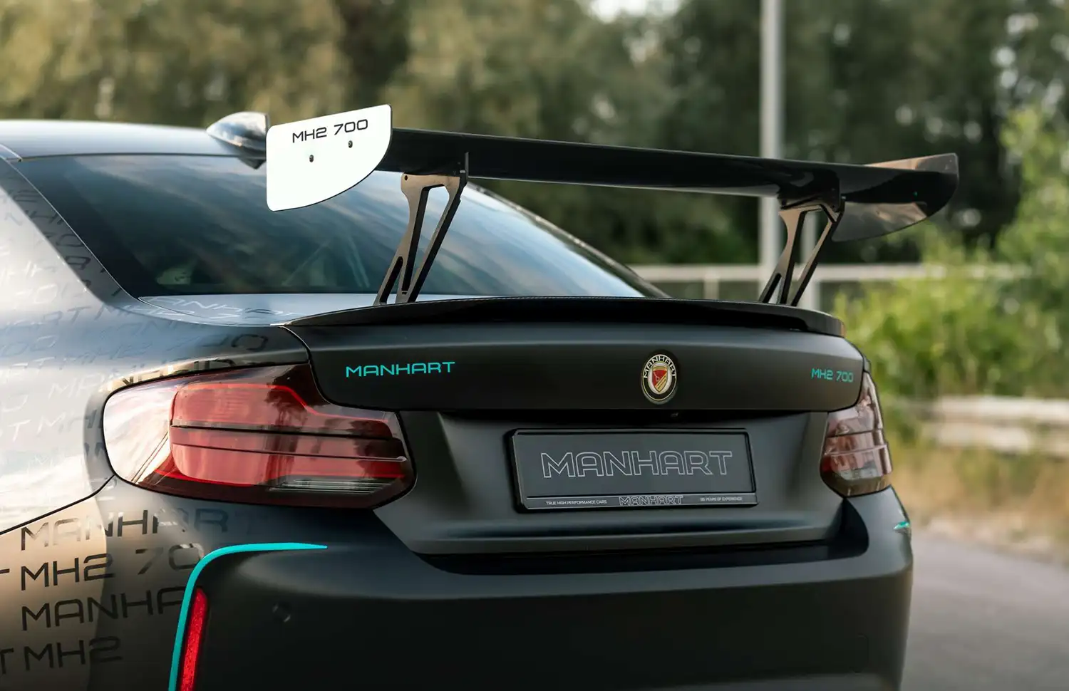 Visually, the MH2 700, as indicated, relies on much more than the proven MANHART Concave One rims in matte black and 9×20 and 10.5×20 inches respectively. The tyres measure 255/30 ZR20 and 295/25 ZR20. The compact coupé also has a MANHART carbon-fibre Clubsport rear wing, a MANHART CS-style bonnet, a MANHART carbon-fibre front spoiler and an extremely elaborately designed MANHART decal set in black with mint green details. Side skirt attachments, a rear spoiler lip and a diffuser round off the styling. They are also each made of carbon and come from the BMW M Performance programme. Last but not least, the interior is upgraded with Recaro Sportster CS bucket seats, a MANHART Clubsport roll bar, colour accents in mint green and an AWRON auxiliary display.