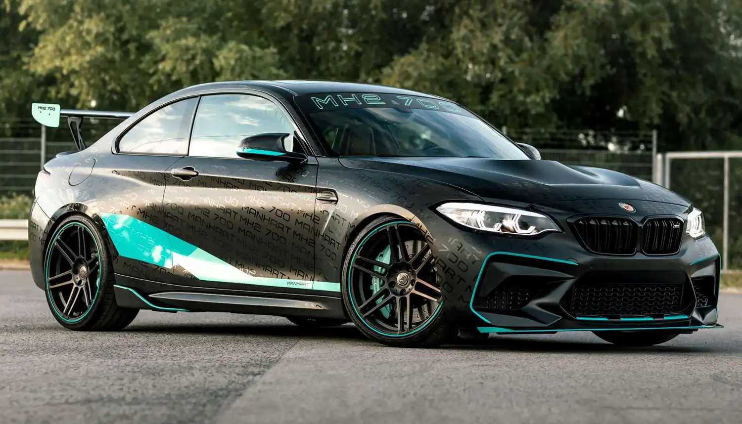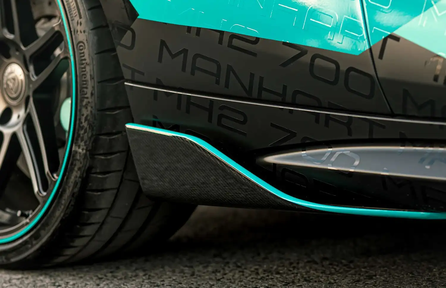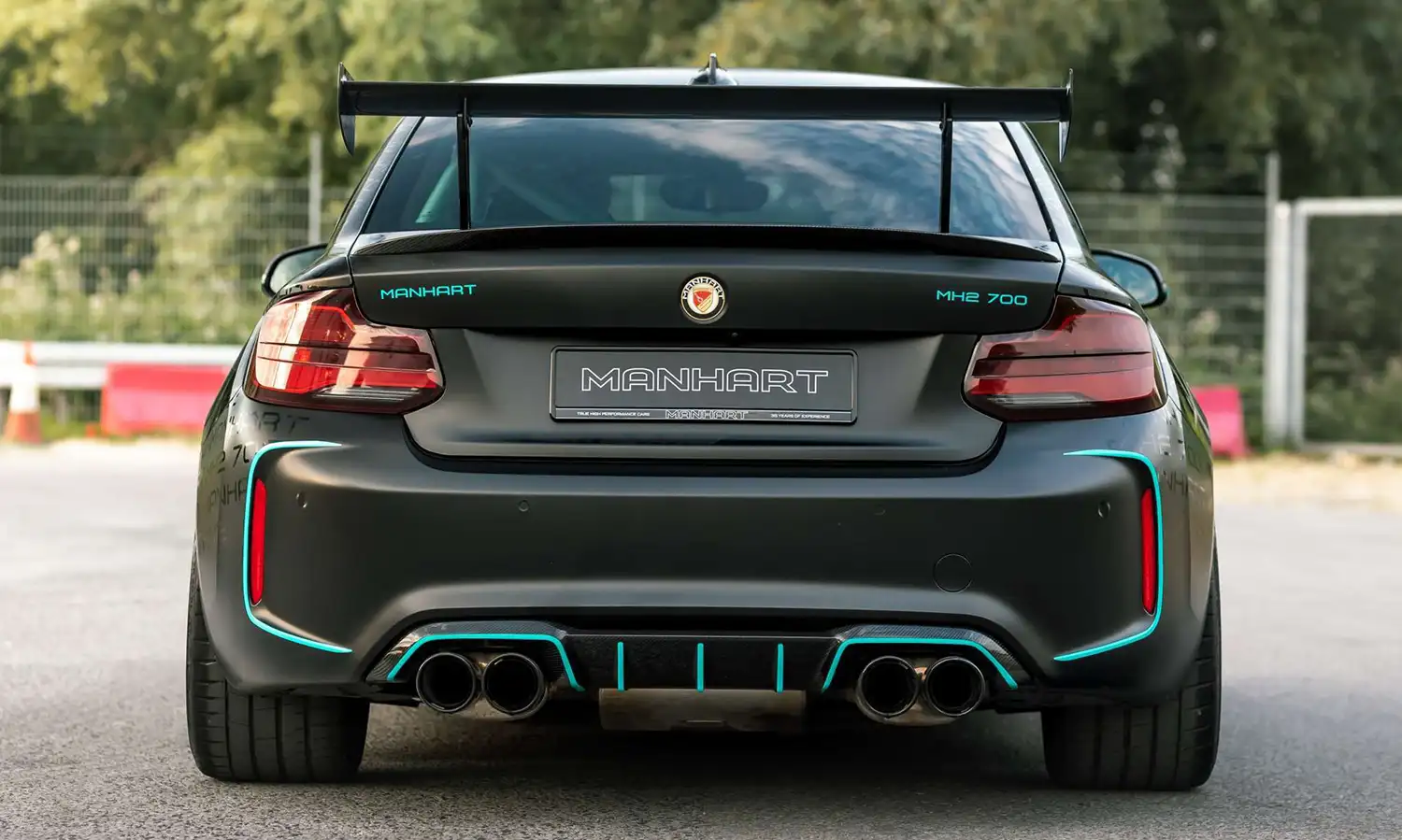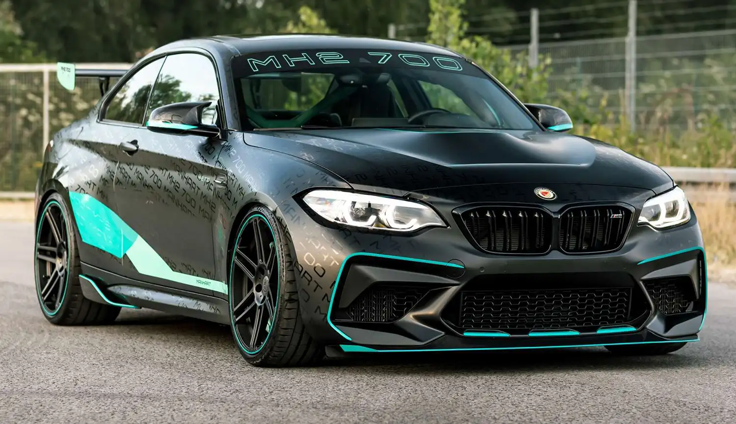 Visually, the MH2 700, as indicated, relies on much more than the proven MANHART Concave One rims in matte black and 9×20 and 10.5×20 inches respectively. The tyres measure 255/30 ZR20 and 295/25 ZR20. The compact coupé also has a MANHART carbon-fibre Clubsport rear wing, a MANHART CS-style bonnet, a MANHART carbon-fibre front spoiler and an extremely elaborately designed MANHART decal set in black with mint green details. Side skirt attachments, a rear spoiler lip and a diffuser round off the styling. They are also each made of carbon and come from the BMW M Performance programme. Last but not least, the interior is upgraded with Recaro Sportster CS bucket seats, a MANHART Clubsport roll bar, colour accents in mint green and an AWRON auxiliary display.