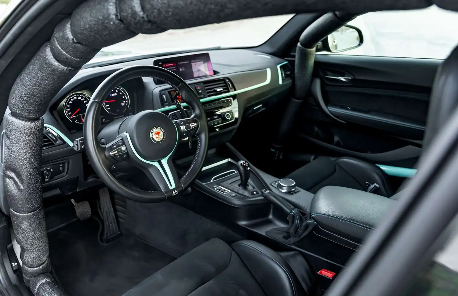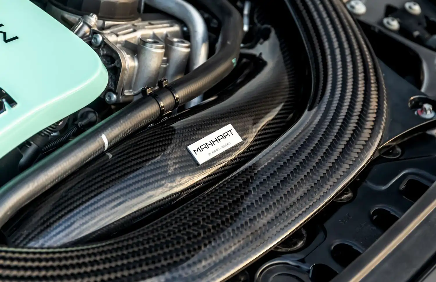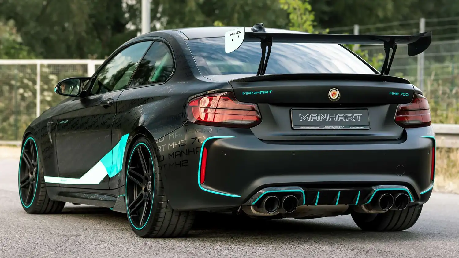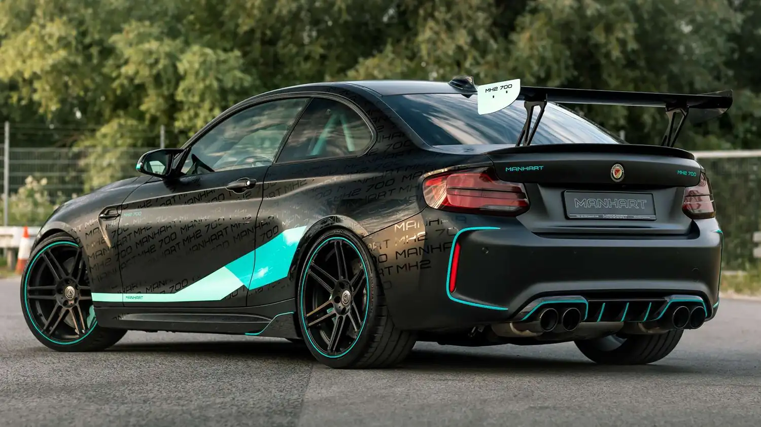 Visually, the MH2 700, as indicated, relies on much more than the proven MANHART Concave One rims in matte black and 9×20 and 10.5×20 inches respectively. The tyres measure 255/30 ZR20 and 295/25 ZR20. The compact coupé also has a MANHART carbon-fibre Clubsport rear wing, a MANHART CS-style bonnet, a MANHART carbon-fibre front spoiler and an extremely elaborately designed MANHART decal set in black with mint green details. Side skirt attachments, a rear spoiler lip and a diffuser round off the styling. They are also each made of carbon and come from the BMW M Performance programme. Last but not least, the interior is upgraded with Recaro Sportster CS bucket seats, a MANHART Clubsport roll bar, colour accents in mint green and an AWRON auxiliary display.