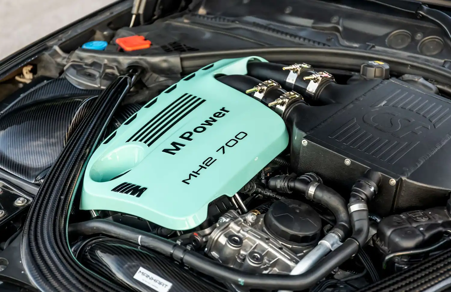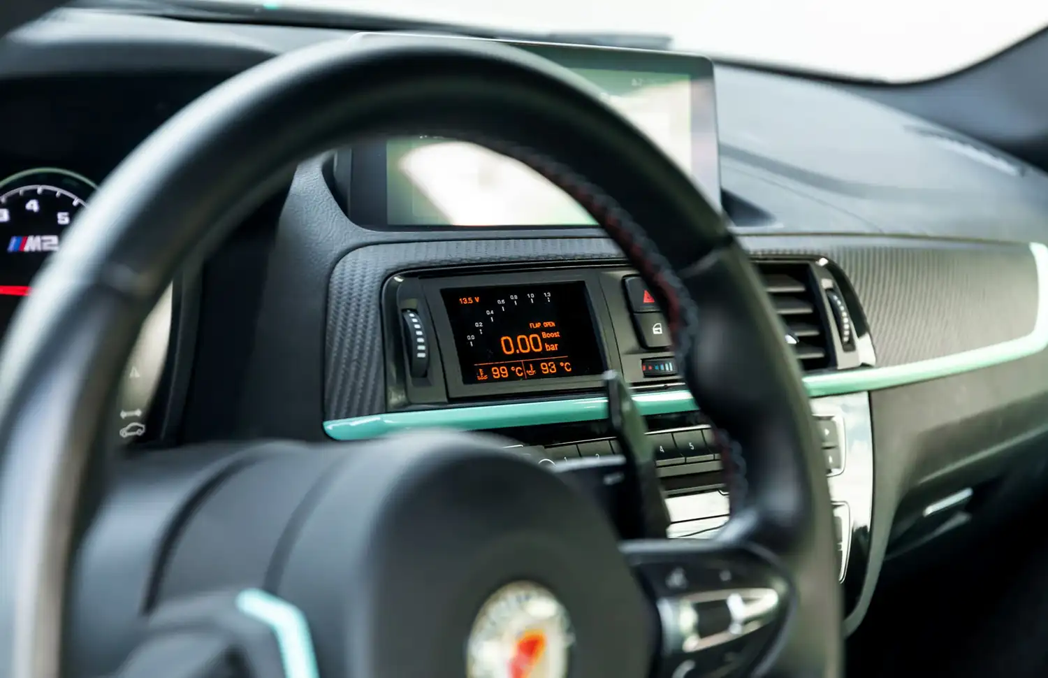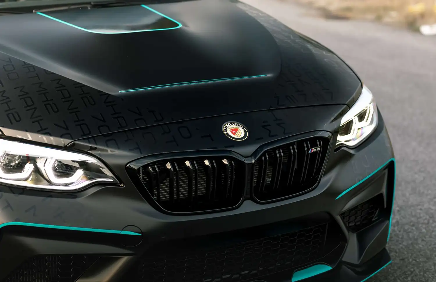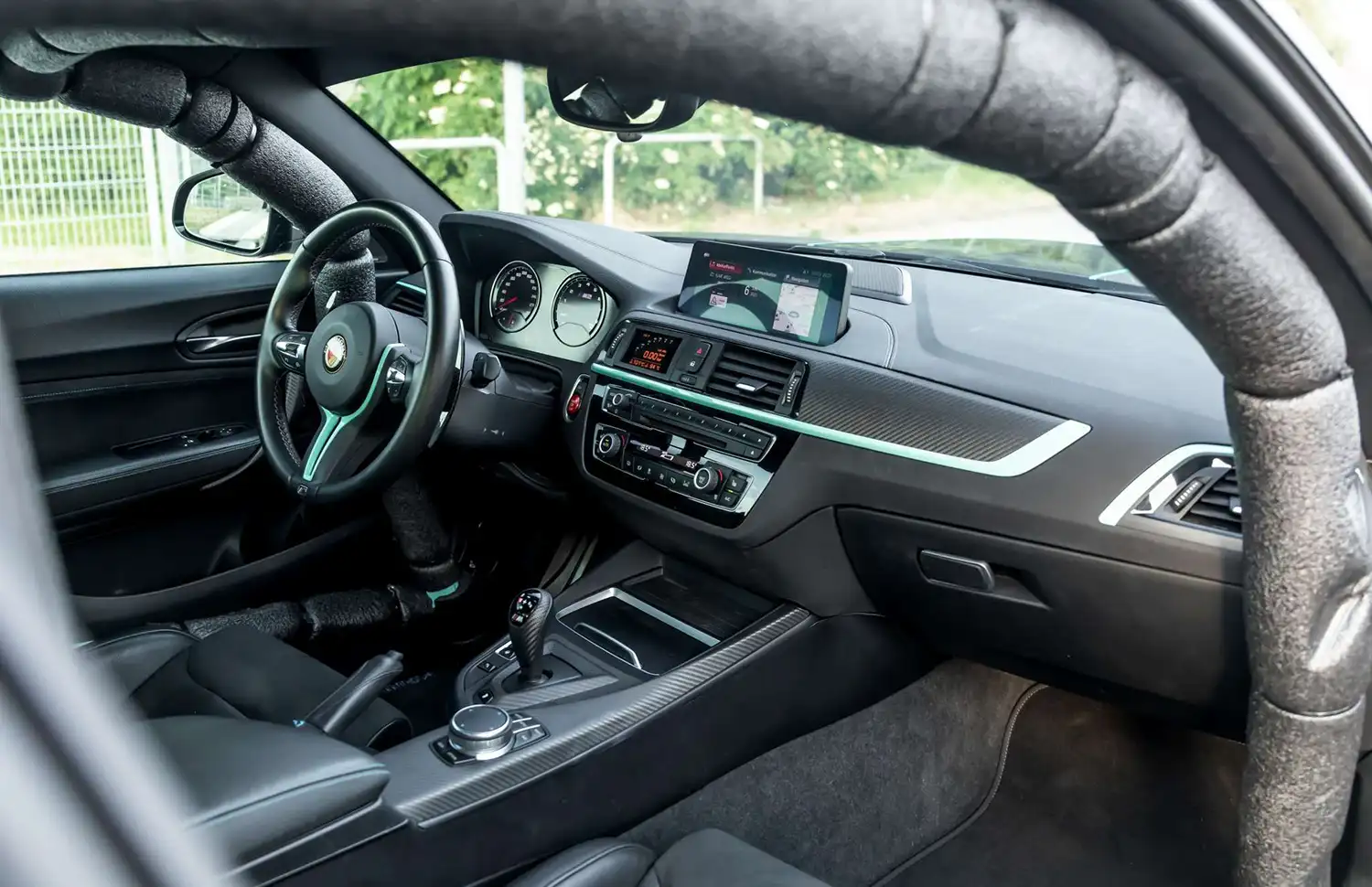 Visually, the MH2 700, as indicated, relies on much more than the proven MANHART Concave One rims in matte black and 9×20 and 10.5×20 inches respectively. The tyres measure 255/30 ZR20 and 295/25 ZR20. The compact coupé also has a MANHART carbon-fibre Clubsport rear wing, a MANHART CS-style bonnet, a MANHART carbon-fibre front spoiler and an extremely elaborately designed MANHART decal set in black with mint green details. Side skirt attachments, a rear spoiler lip and a diffuser round off the styling. They are also each made of carbon and come from the BMW M Performance programme. Last but not least, the interior is upgraded with Recaro Sportster CS bucket seats, a MANHART Clubsport roll bar, colour accents in mint green and an AWRON auxiliary display.