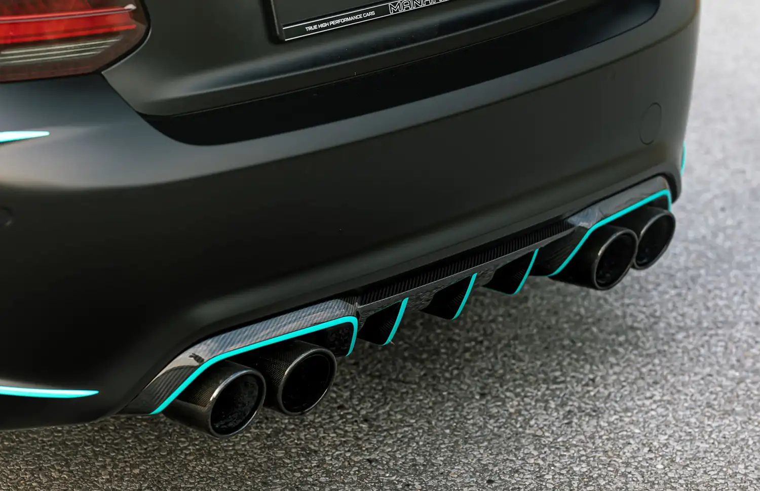 We achieved the increase in horsepower of around 75 percent and a maximum torque of 815 Nm by combining a MANHART ECU remapping with a whole series of hardware optimisations. The 3.0-litre S55 biturbo in-line six-cylinder received a MANHART turbo upgrade including a MANHART intercooler and water cooler by CSF, a MANHART carbon intake by ARMAspeed and a MANHART engine boost for up to 1,200 hp as well as MANHART charge pipes made of aluminium. Added to this is a MANHART stainless steel exhaust system with valve function and four matt-black MANHART 100 mm tailpipes. It is combined with MANHART Race downpipes, MANHART OPF Delete replacement pipes made of stainless steel including 300-cell catalytic converters and the MANHART OPF/GPF Deleter. These three components are each exclusively for export, as they do not have TÜV approval.