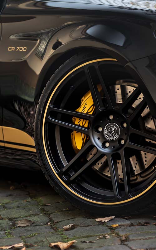 The wheel arches of the station wagon are fitted with Manhart own Concave One wheels in satin black, which – in keeping with the typical MANHART body decor – are decorated with gold rim pinstripes. The 9×20 and 10.5×20 inch double-spoke rims are fitted with 255/30ZR20 high-performance tyres on the steering axle and 275/30ZR20 tyres on the drive axle.
