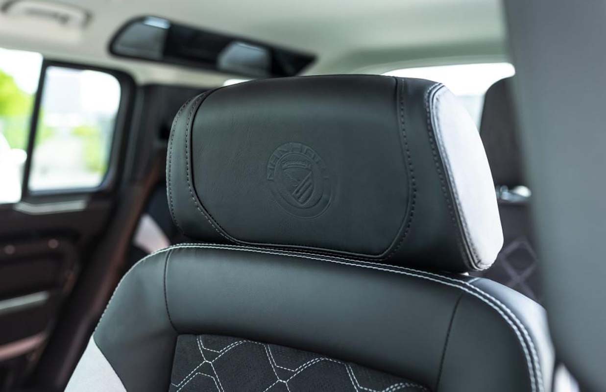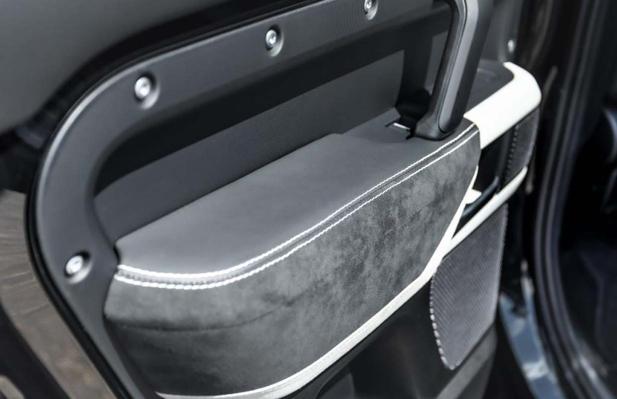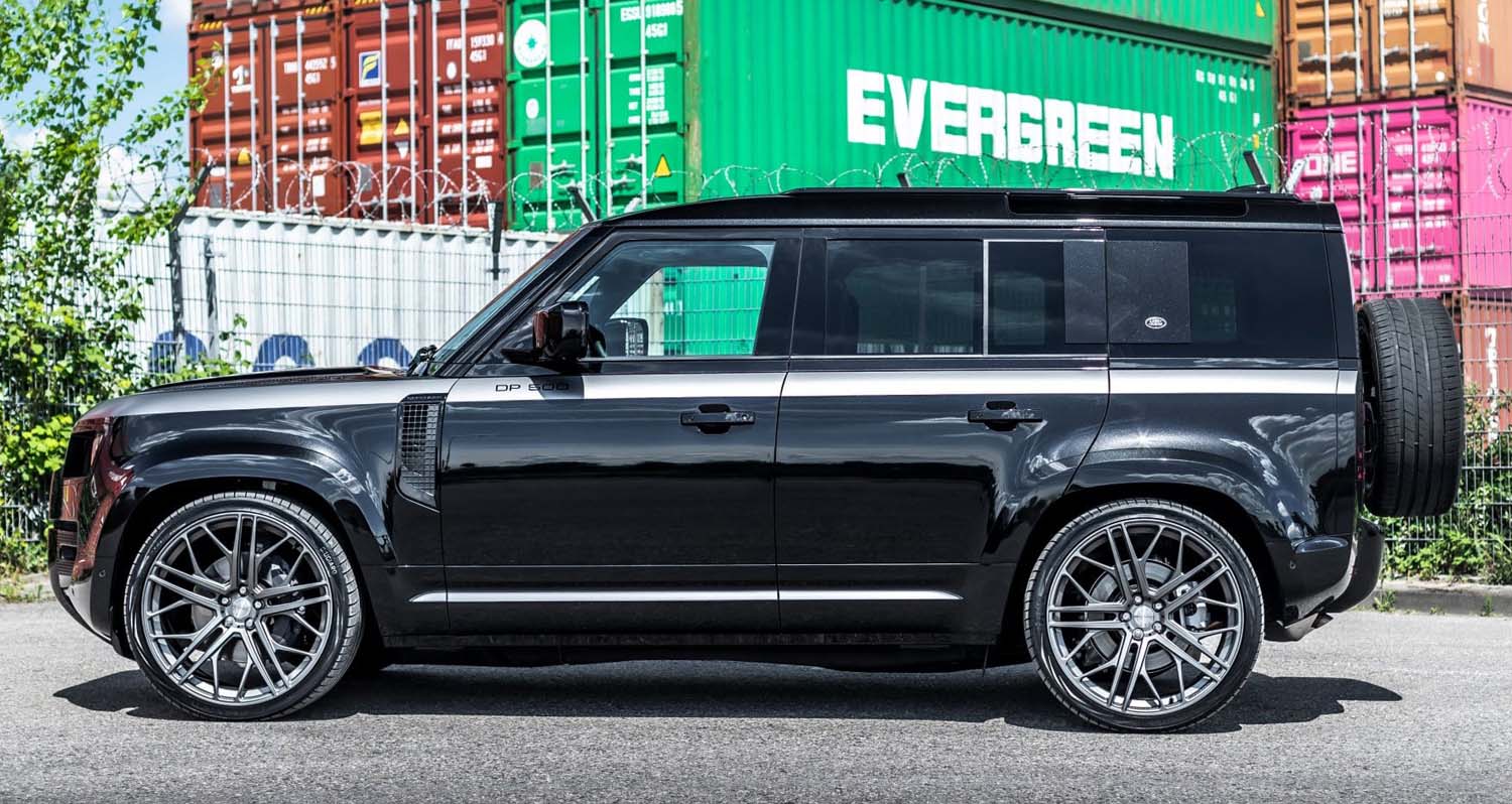 Visually, the DP 500 is particularly eye-catching with its new wheel set: MANHART Forged Line rims in 10×24 inch, with a light grey finish and 295/30ZR24 tyres. For those who prefer a smaller wheel set that is also more suitable for off-road use, there is the Concave One in 10.5×22 inch with black finish and gold trim and 295/40 tyres, which is mounted on the rear as a spare wheel. Further visual accents are set on the one hand by masculine wing flares, which give the Defender considerably broader shoulders and – like all other exterior components and the engine cover – are painted in body colour, and on the other hand by decorative silver stripes applied to the black bodywork.