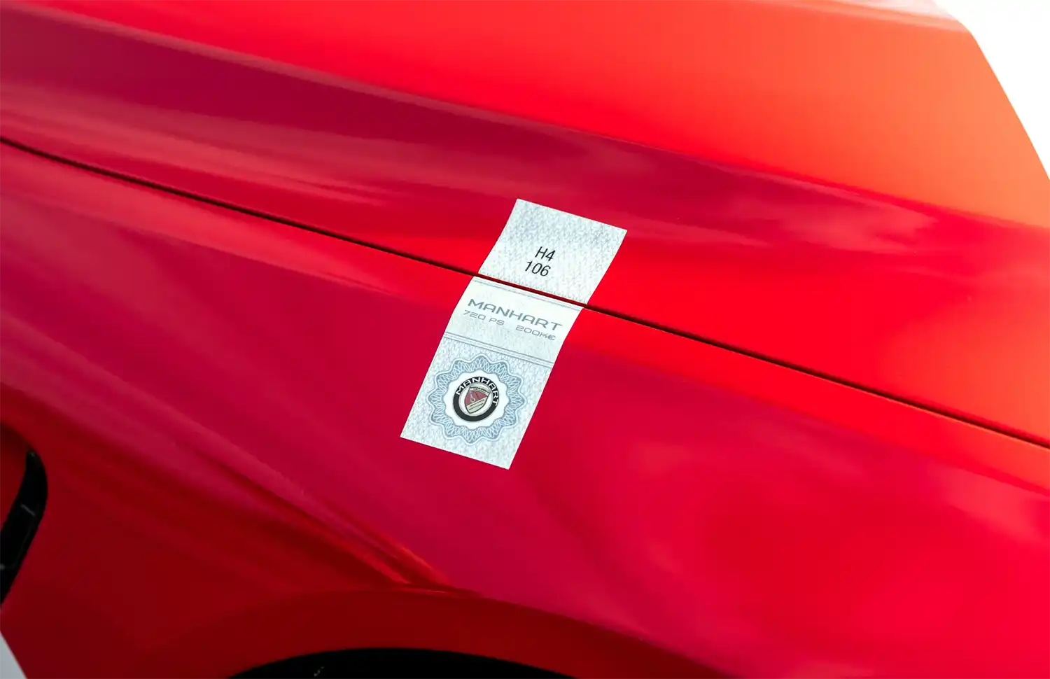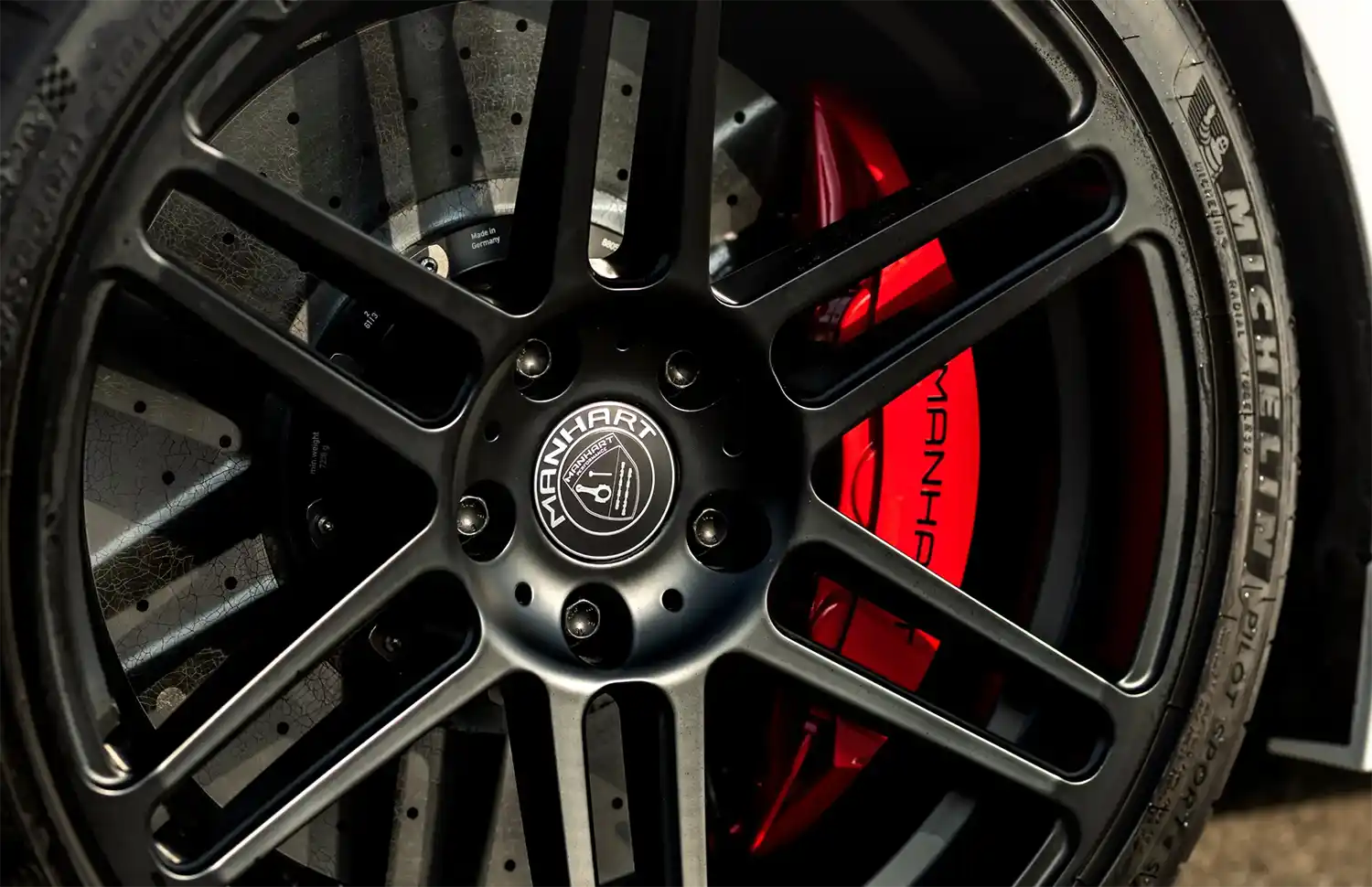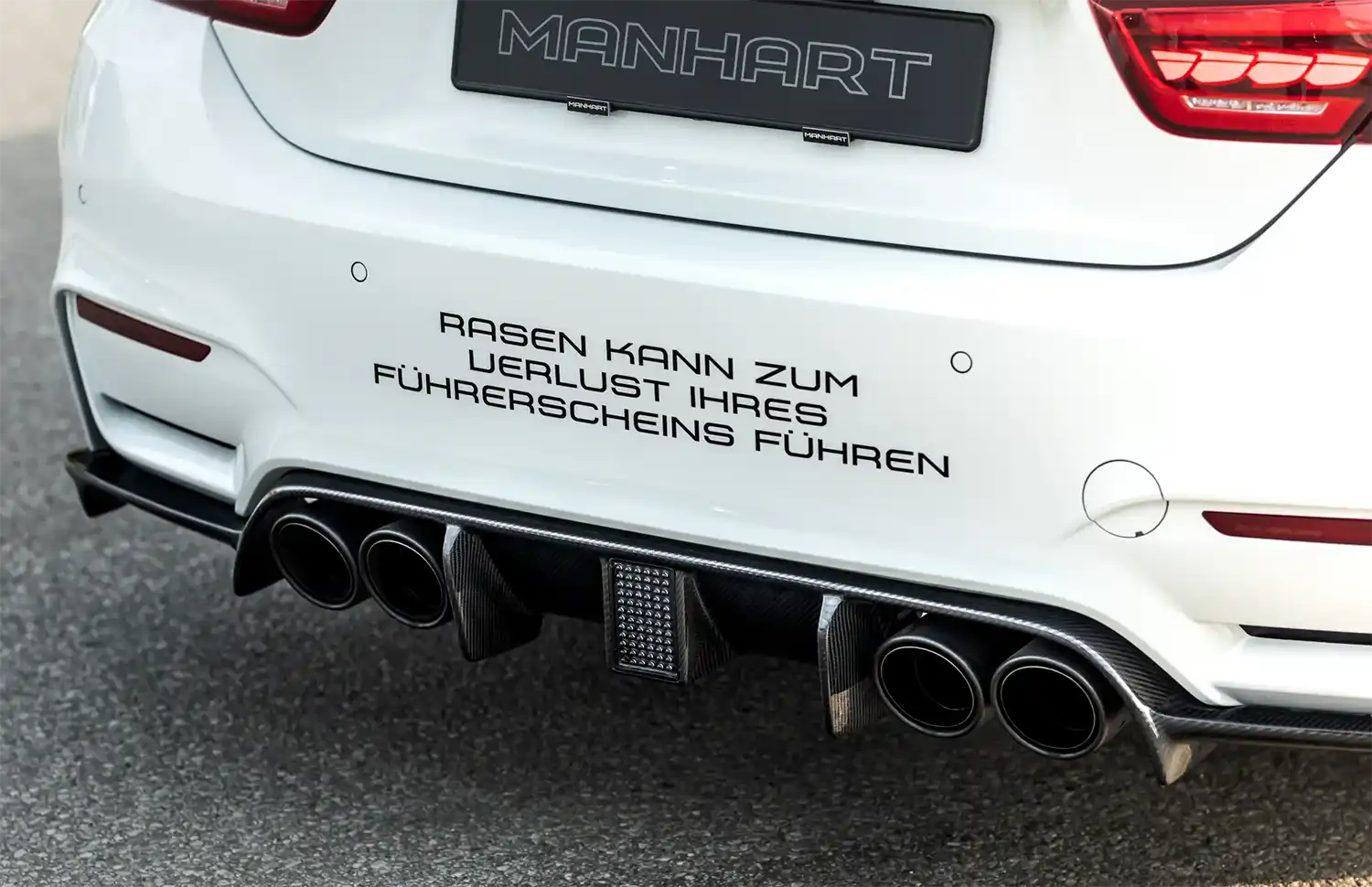 In conjunction with a MANHART ECU remapping, the result is 708 hp and 980 Nm of maximum torque instead of the factory 500 hp and 600 Nm. Of course, the MANHART stainless steel exhaust system with valve control and four 100-millimetre tailpipes encased in carbon was not to be missed. MANHART race downpipes without catalytic converters are also on board, although they do not have TÜV approval and are therefore only intended for export.