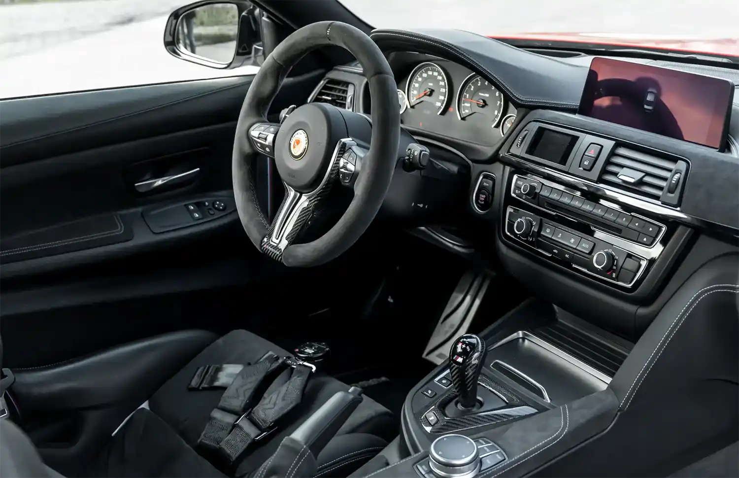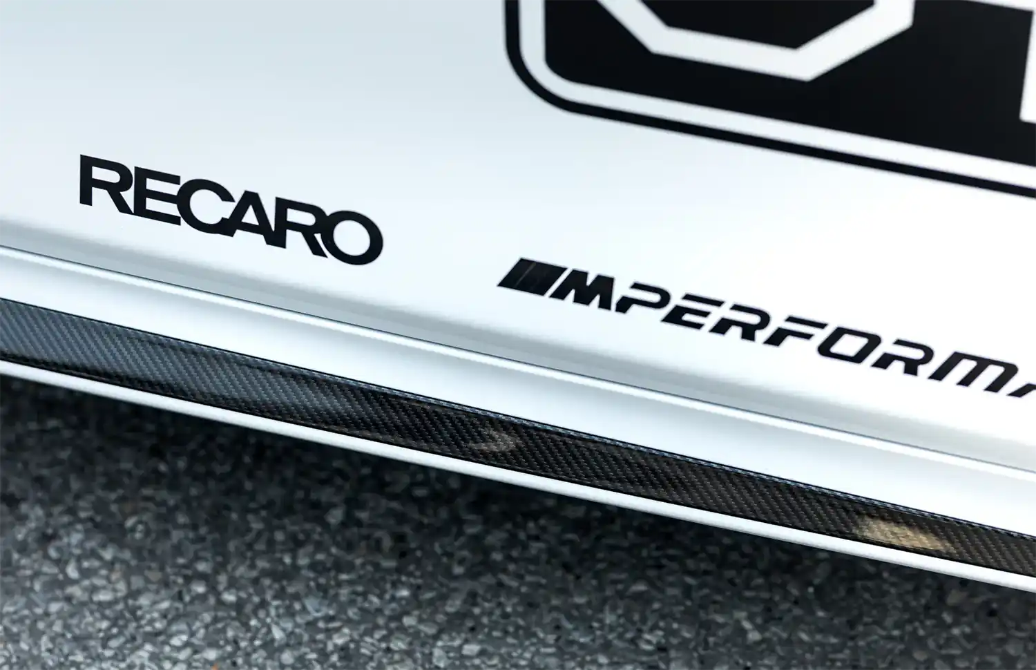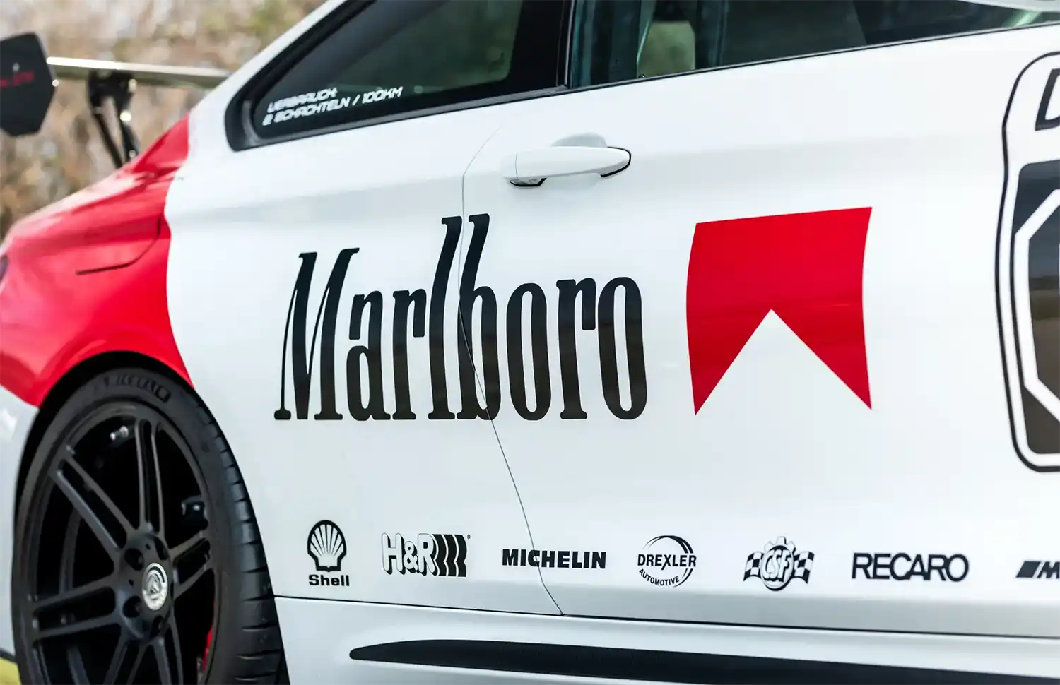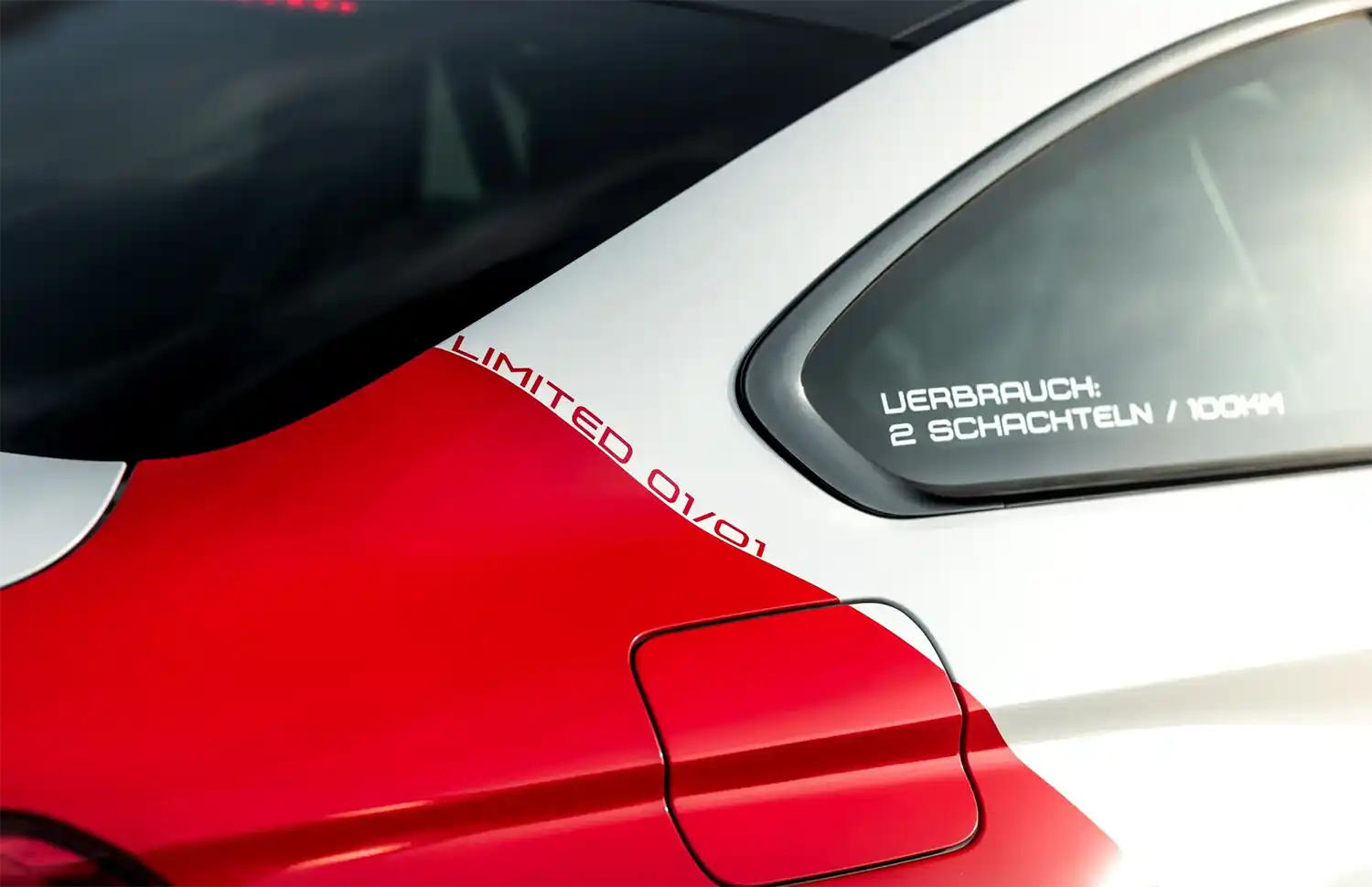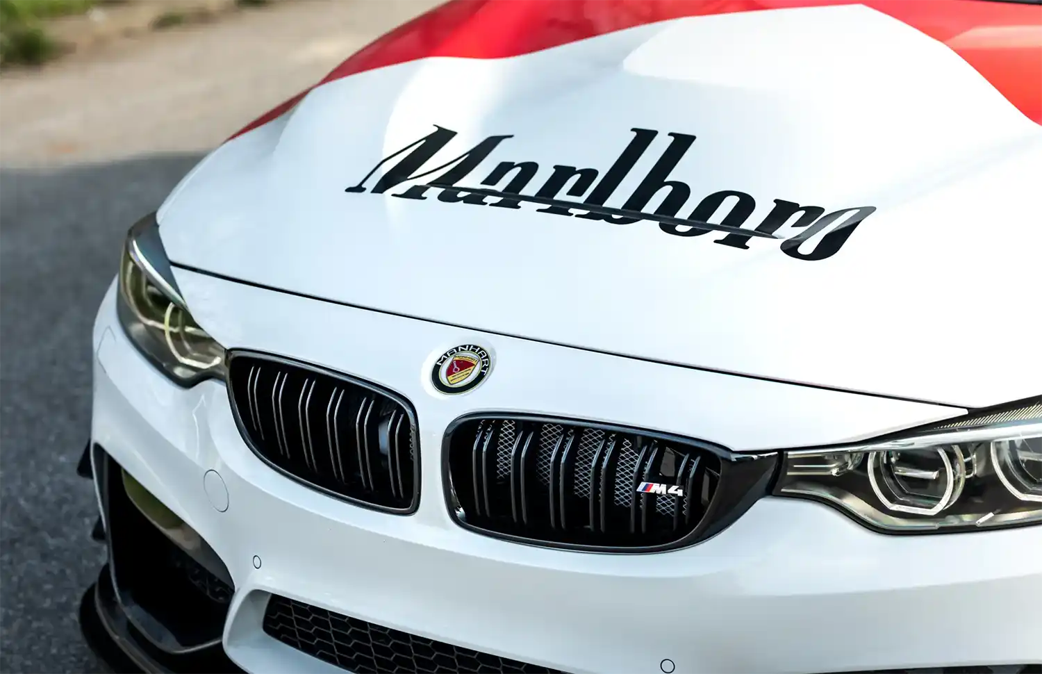 With its white paintwork and styling in the BMW M colours, as well as numerous carbon add-on parts, the 2016 DTM Champion Edition is already very sporty and eye-catching as standard. Nevertheless, Manhart have gone one better here with their own add-on parts: The front is refined by a spoiler lip and side skirt attachments. They are also made of carbon fibre, as are the large rear wing and the diffuser. The M Performance Parts range is rounded off with a spoiler lip and carbon mirror caps. A real highlight is also the livery in the classic red and white Marlboro Motorsport design. Last but not least, the axles are fitted with satin black MANHART Concave One rims in 9×20 and 10.5×20 inch. The mounted Michelin tyres measure 255/35 ZR20 and 295/30 ZR20.