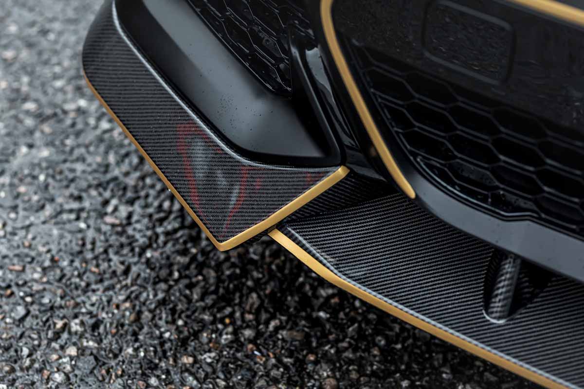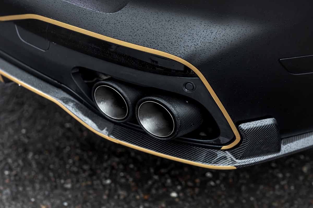 But speaking of carbon: the exterior parts installed by MANHART team are made of the super-light high-tech composite material – as the characteristic shimmer of their clear-coated fibre fabric reveals: the new carbon front spoiler with strikingly shaped winglets quotes motorsport just as much as the visually matching rear diffuser; furthermore, the exterior mirror housings are made of carbon. Almost obligatory for a MANHART vehicle is the golden decal set – seen here on a matt black vinyl background.