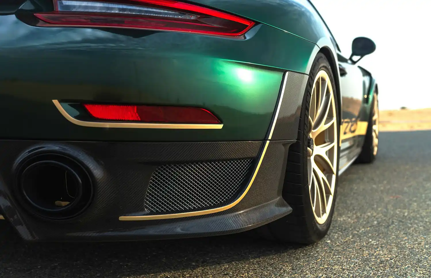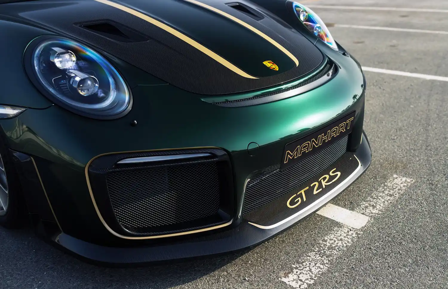 As far as the bodywork is concerned, the 911 GT2 RS has been given a whole series of MANHART attachments by DB Carbon made of high-quality carbon fibre composite material, which guarantee it an even more exclusive and dynamic appearance: Installed are a front spoiler including side extensions, frames for the air intakes in the front, side skirts and a diffuser including side extension plates.
