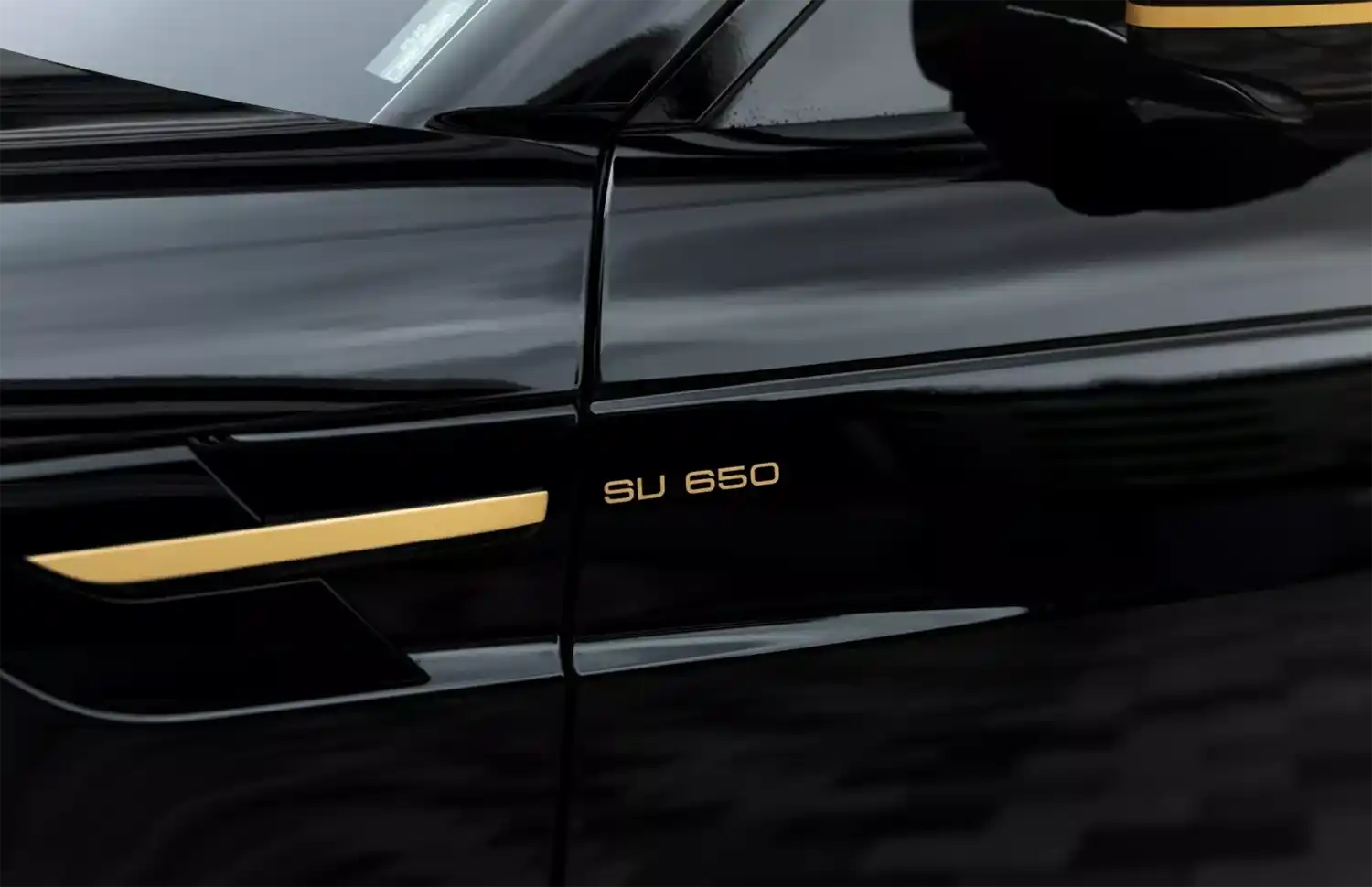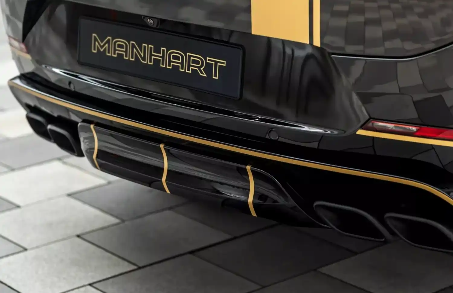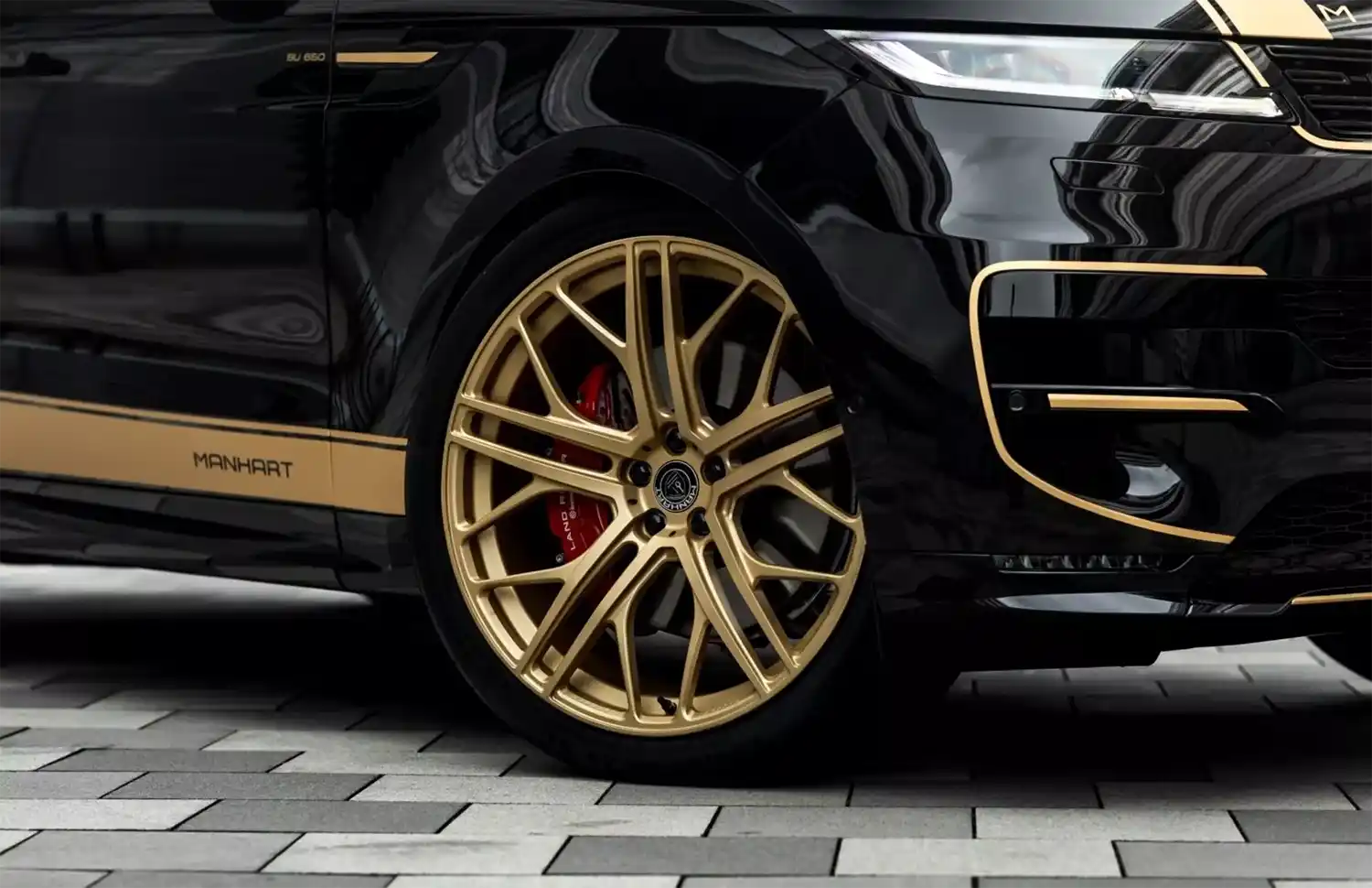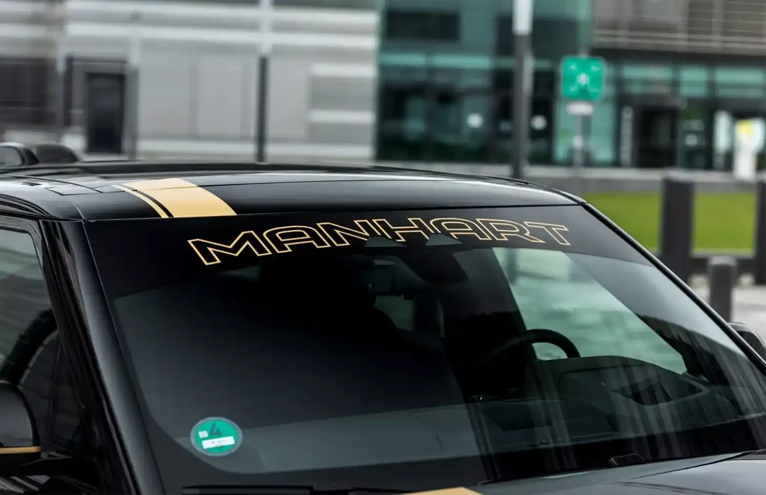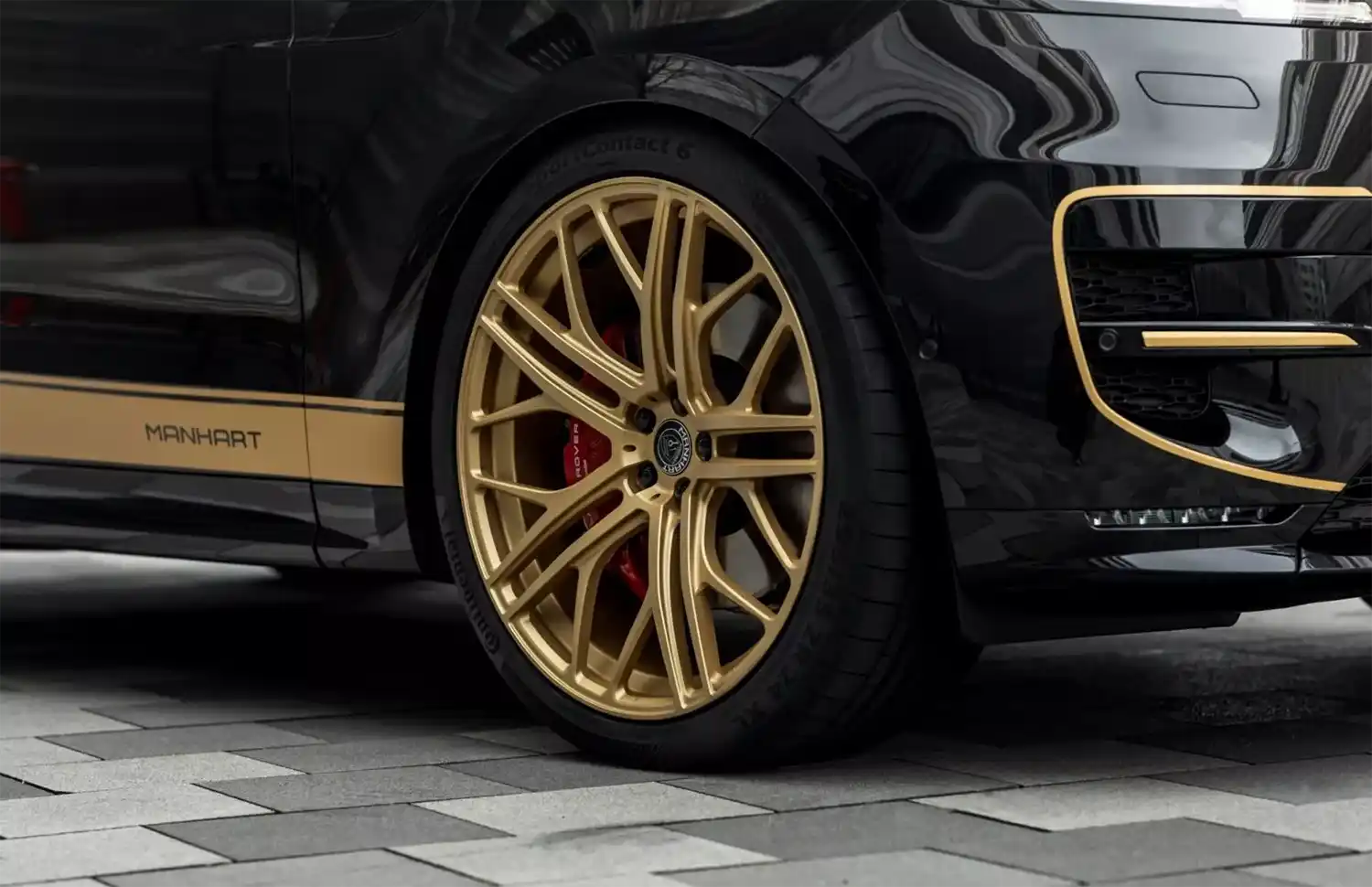 Visually, the rims attract attention with their combination of double and Y-spokes and the finish in MANHART-typical gold. Last but not least, they perfectly match with the individual design of the body: thanks to the MANHART decal set, numerous gold-colored lettering and trim strips extend over its black paintwork.