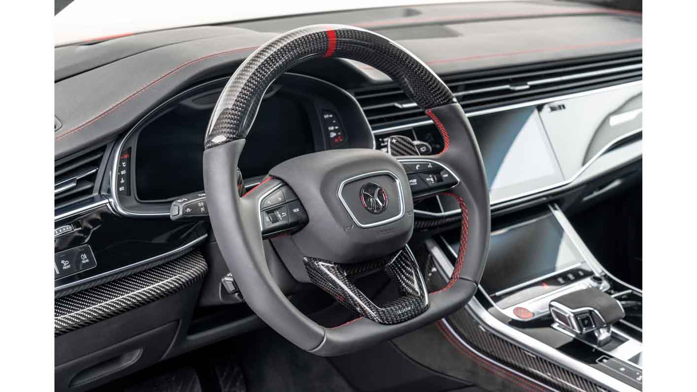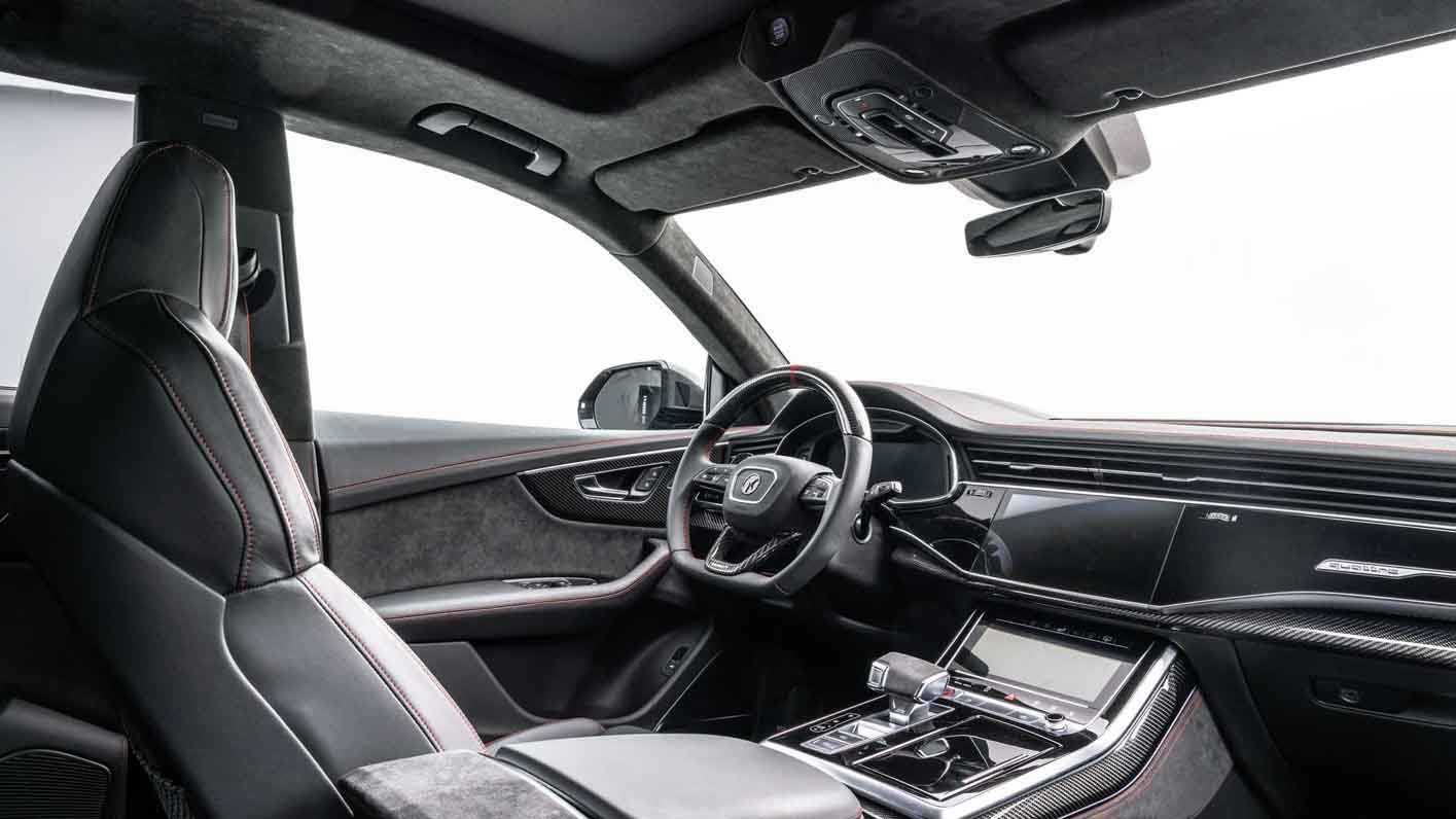 MANSORY also sets discreet and stylish accents in the interior of the RSQ8, thus continuing the elegant design language of the exterior into the interior, which is also done in black and red. Red contrasting seams on all leather components, carbon-fibre trim and a MANSORY steering wheel in leather-carbon finish of the finest quality are particularly noteworthy.