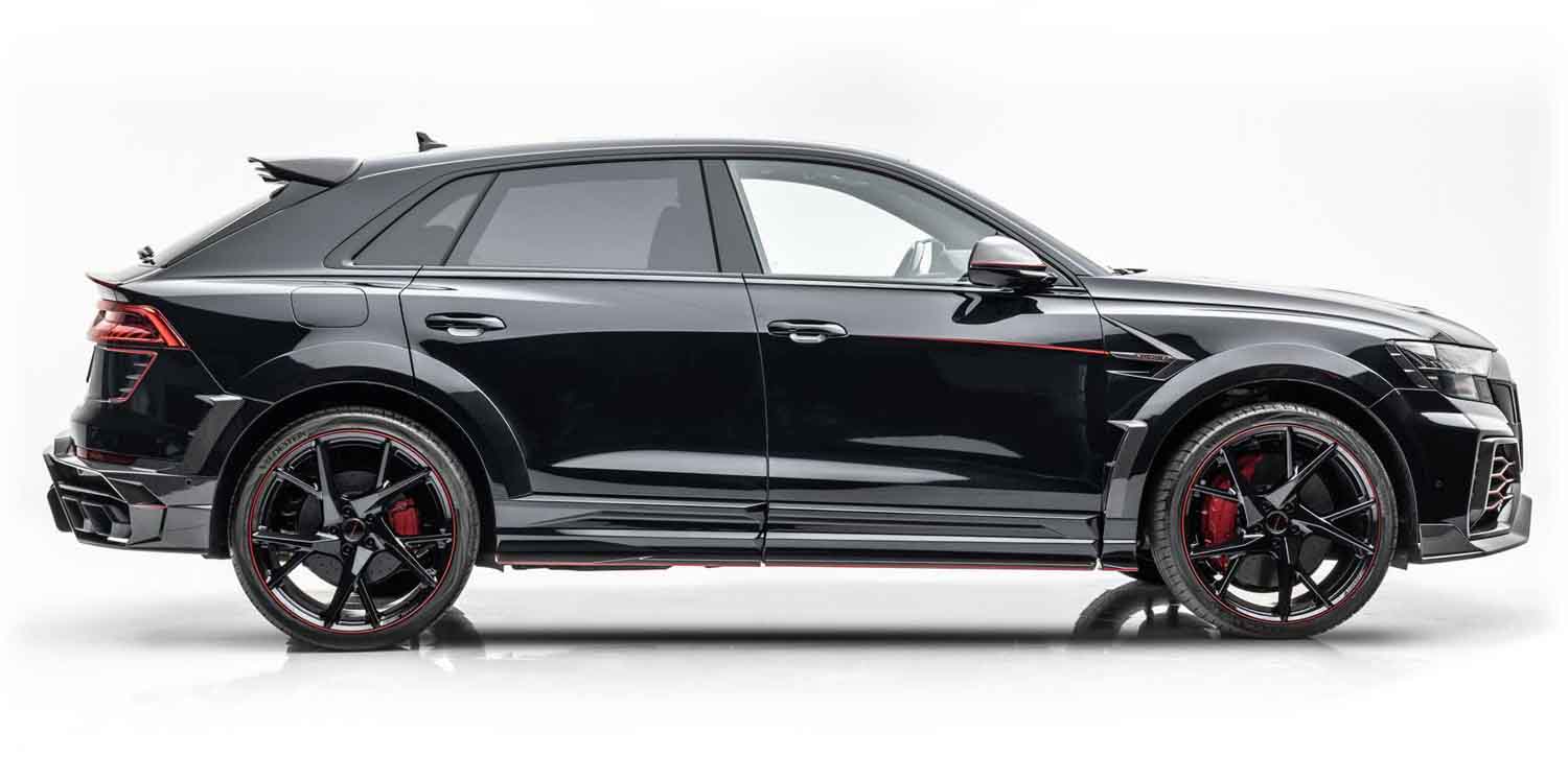 In combination with the deep black paint finish and the red decorative stripes that begin at the front edge of the bonnet and run across the entire vehicle, the numerous MANSORY conversions on the entire exterior powerfully and elegantly emphasise the design language of the RSQ8 and give the car a harmonious overall appearance that attracts attention like magic.