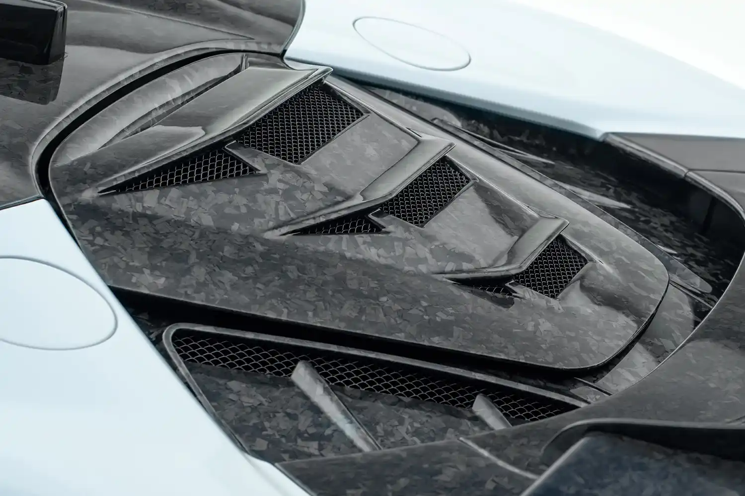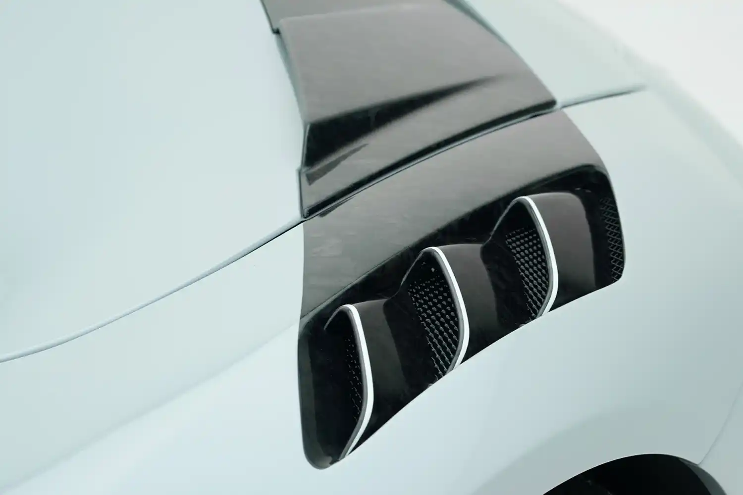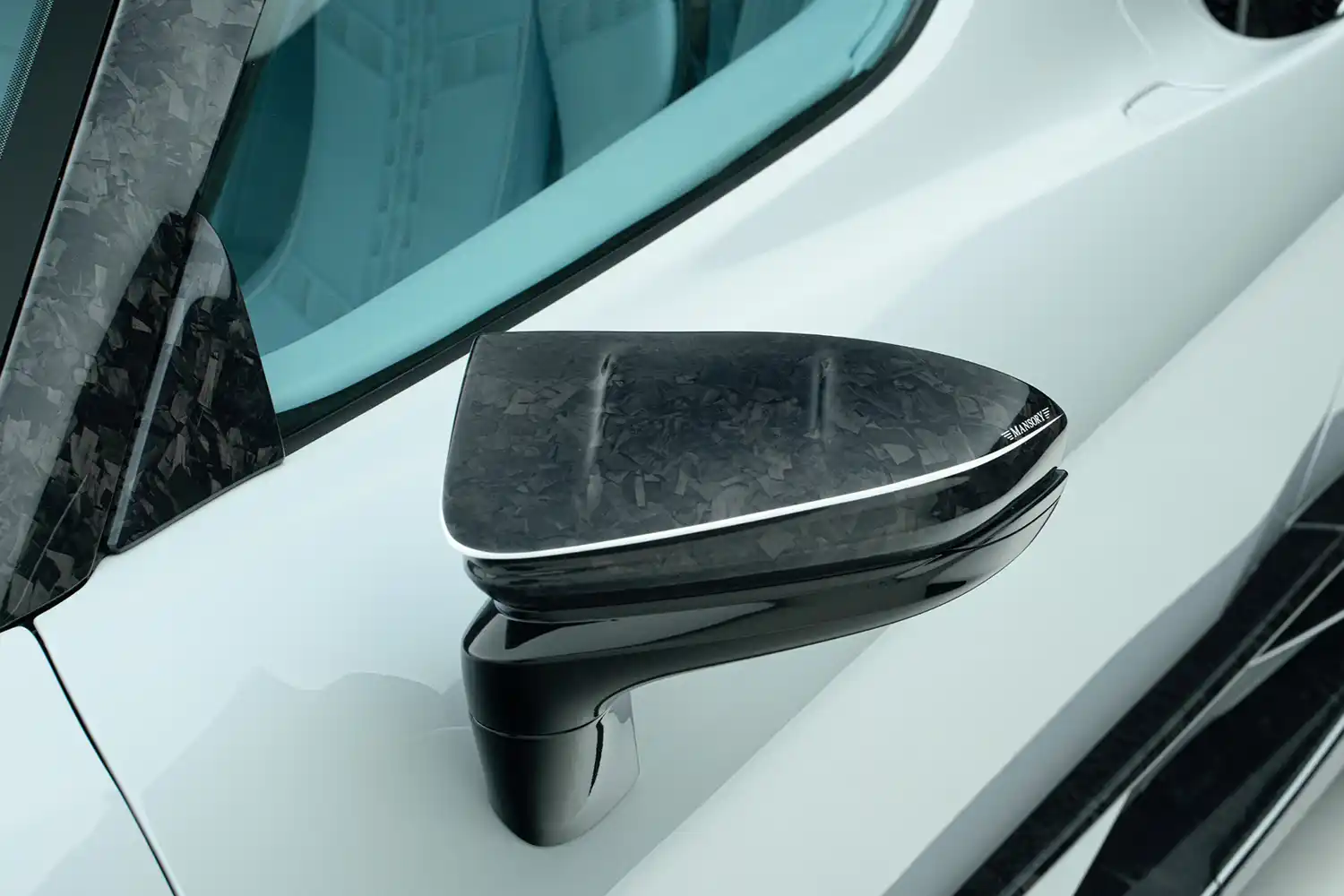 At the side, striking sills show the unmistakable signature of MANSORY. And also here: visual pleasure and technical functionality go hand in hand, because the new carbon body components do not only look impressively good, they also act as air ducts, supplying large amounts of fresh air to both the power unit under the new full-carbon bonnet and the rear brake system.