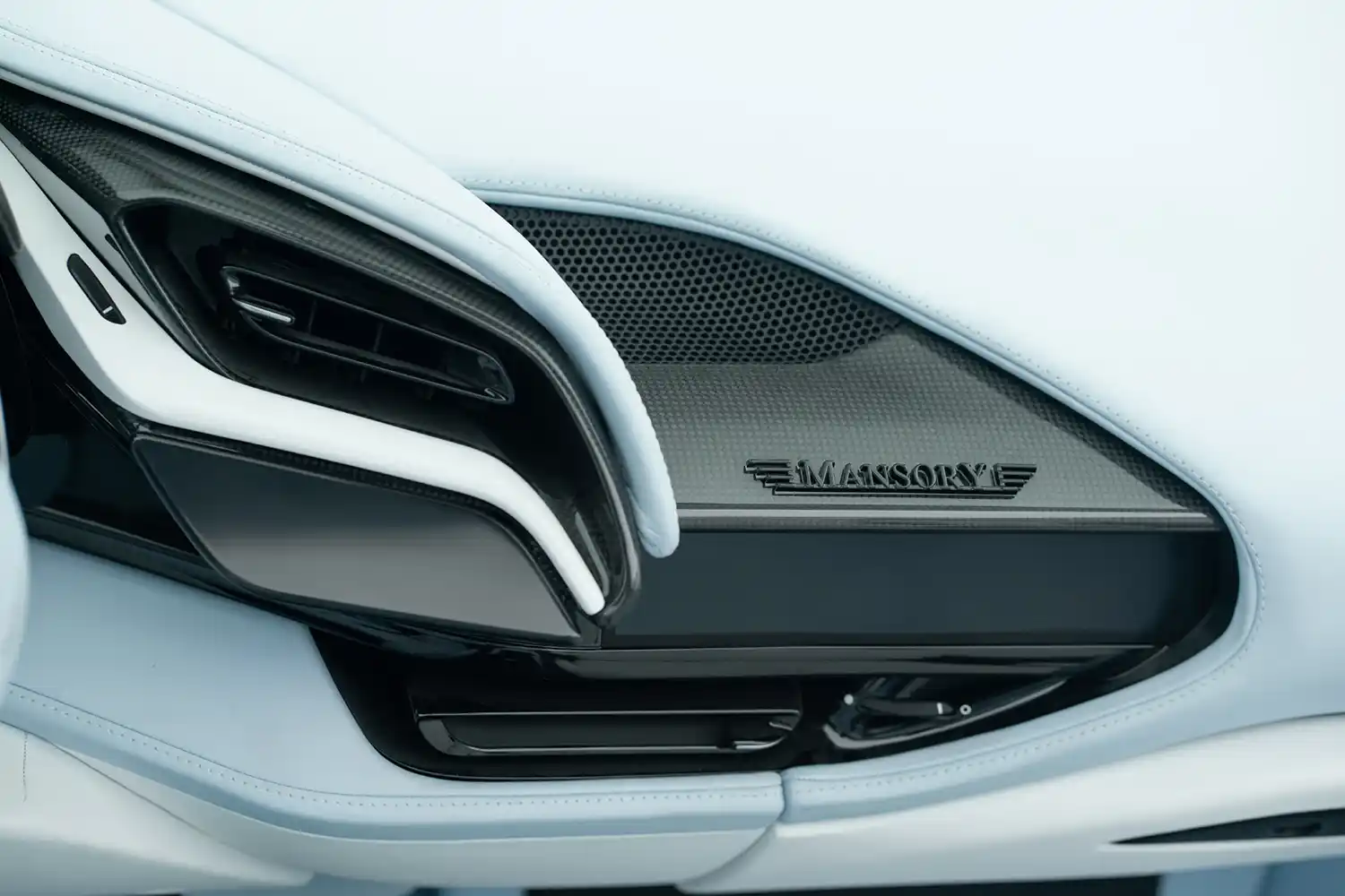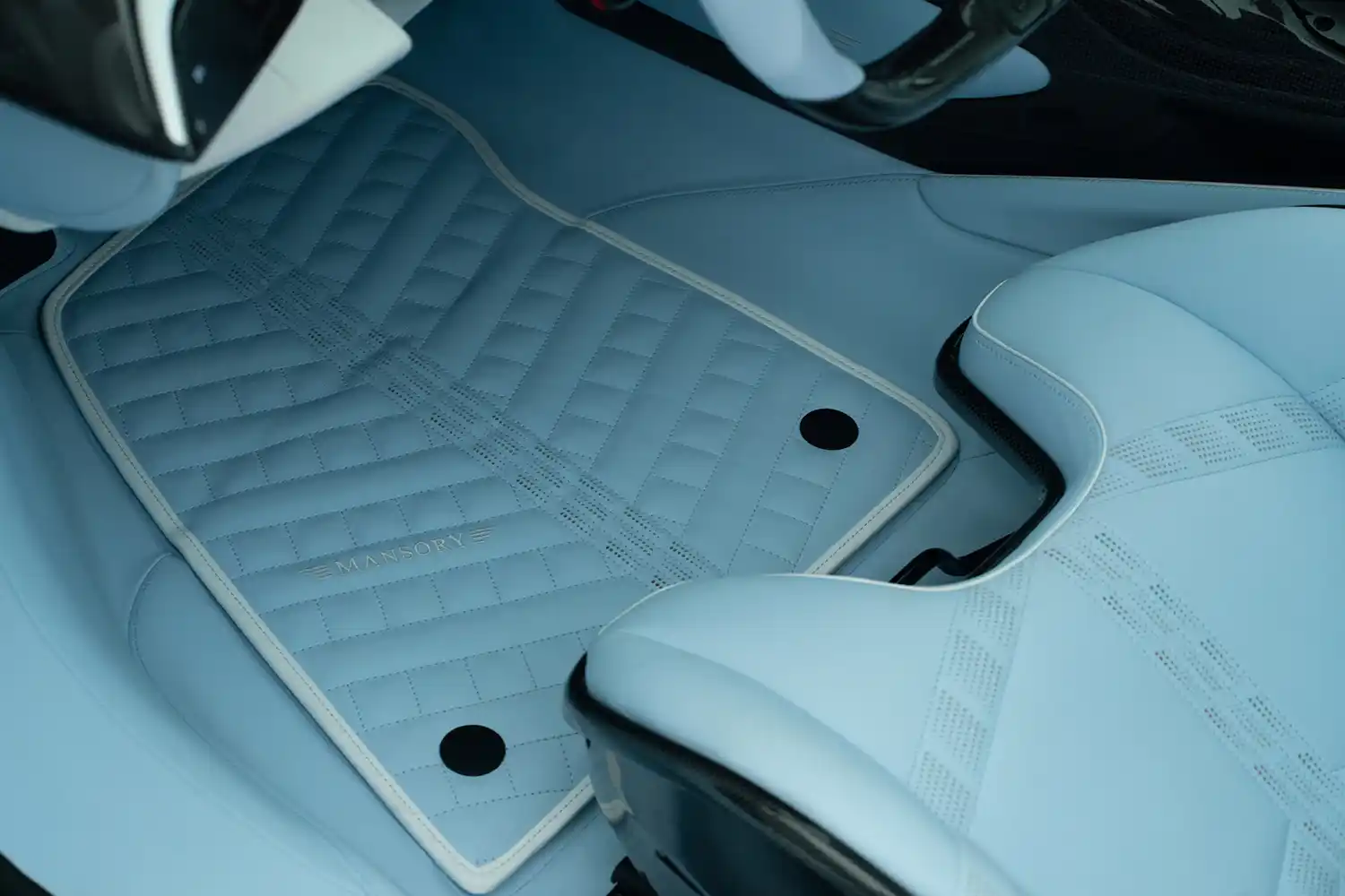 The interior of the “MANSORY F9XX – Tempesta Celeste” is sporty and at the same time elegantly oriented due to its consistent light blue colour and is completely upholstered with high-quality leather up to the last corner of the interior. The leather-covered carbon sports seats in particular are the visual highlight of the interior and create an atmosphere that perfectly combines high functionality, elegance, comfort and exceptional design. Where leather is not (or cannot be) used, the interior is selectively accentuated with carbon. A MANSORY sports leather steering wheel, MANSORY leather floor mats and several, precisely embroidered MANSORY logos elegantly round off the fully comprehensive refinement in the interior.