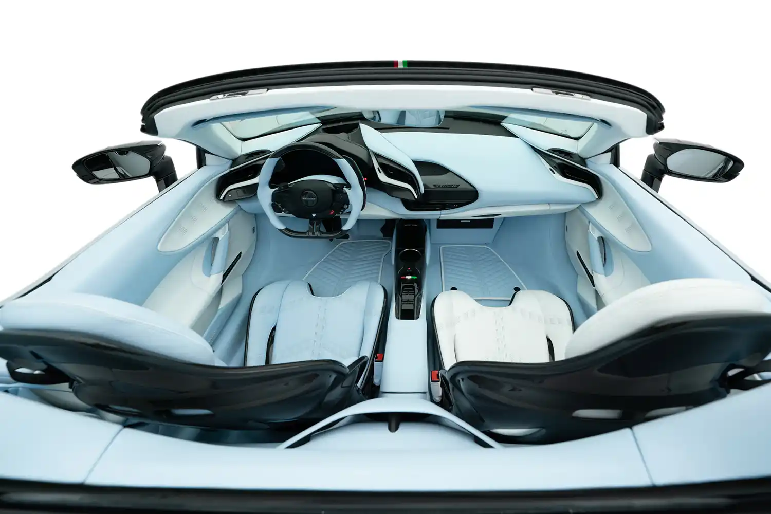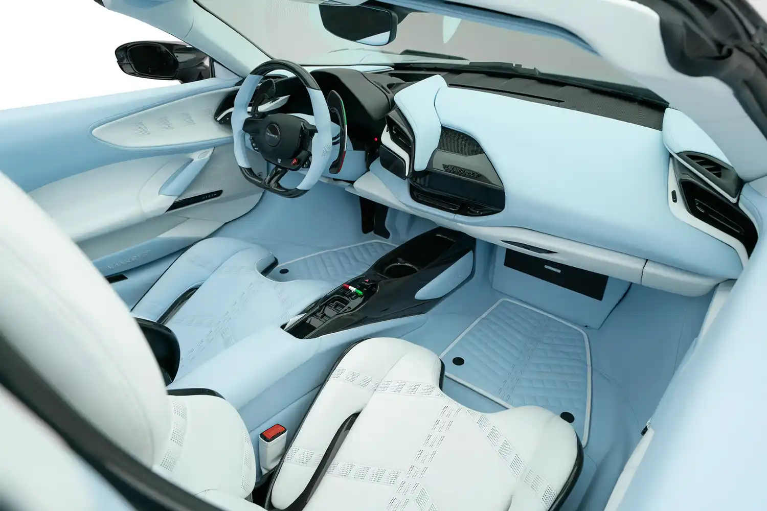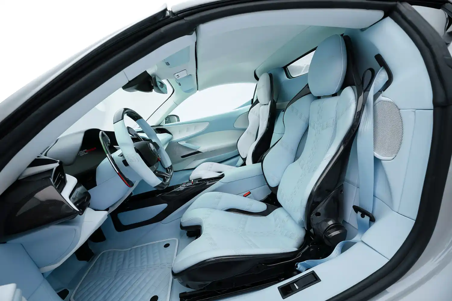 In addition to the visual changes, the technology of the “MANSORY F9XX – Tempesta Celeste” also undergoes subtle but very effective revisions. As a result, the 4.0-litre V8 biturbo mid-engine now delivers 980 hp and 980 Nm to the crankshaft instead of the already impressive 780 hp and 800 Nm as standard. In combination with the support of its three electric motors (two on the front axle and one for the rear axle), the “MANSORY F9XX – Tempesta Celeste” thus surpasses the magic power limit of 1,000 hp and achieves a fabulous system output of 1,100 hp.