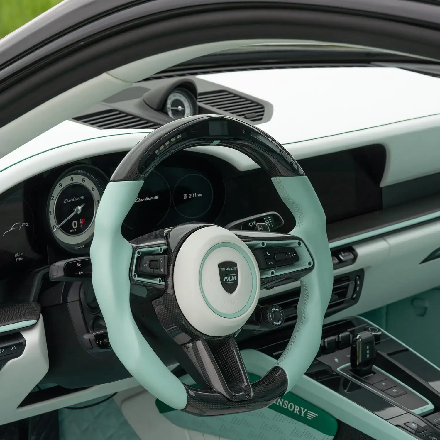 The interior of the “P9LM EVO 900” is also completely redesigned and undergoes many individual upgrades. For example, the steering wheel is clad half in carbon and half in leather, and the lateral steering wheel spokes are painted to match the colour of the leather. In the upper part, the carbon ring of the steering wheel shows a shift light and a digital display for speed and engine revs. The interior as such is completely reupholstered with high-quality, glove-soft leather down to the last corner.