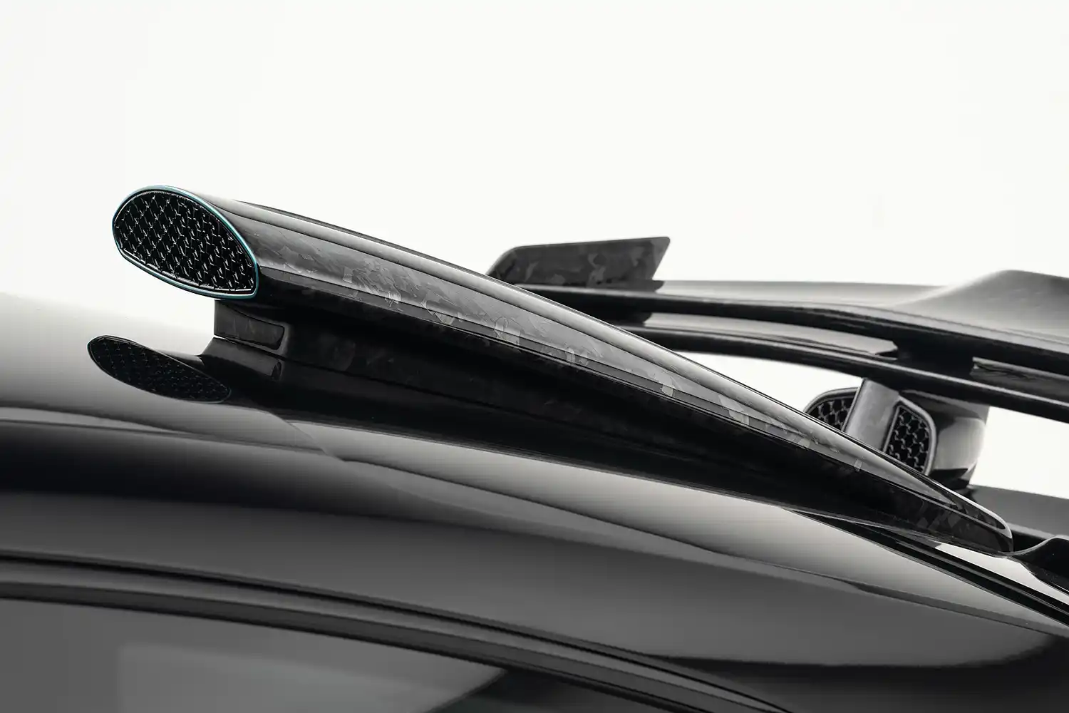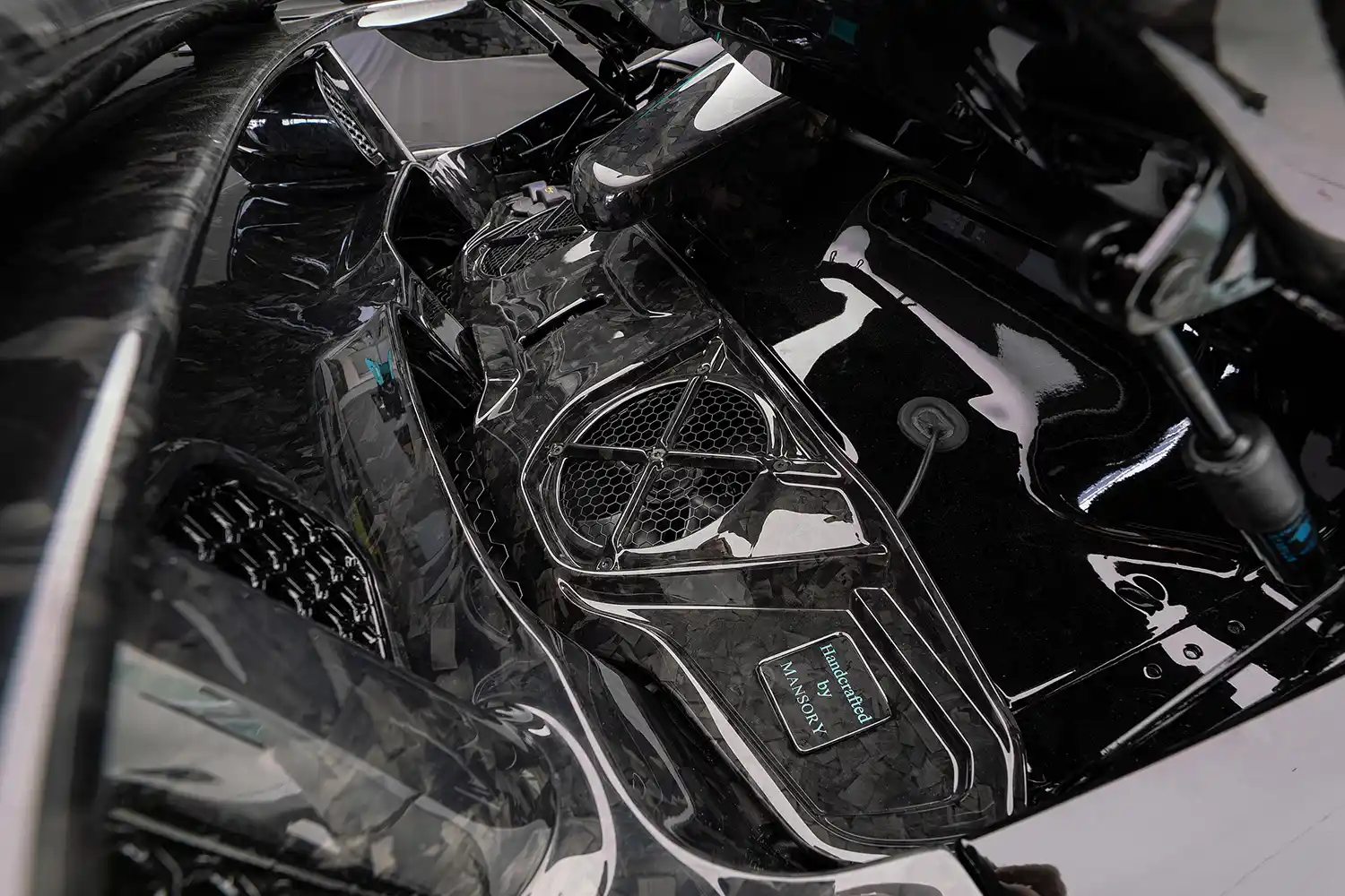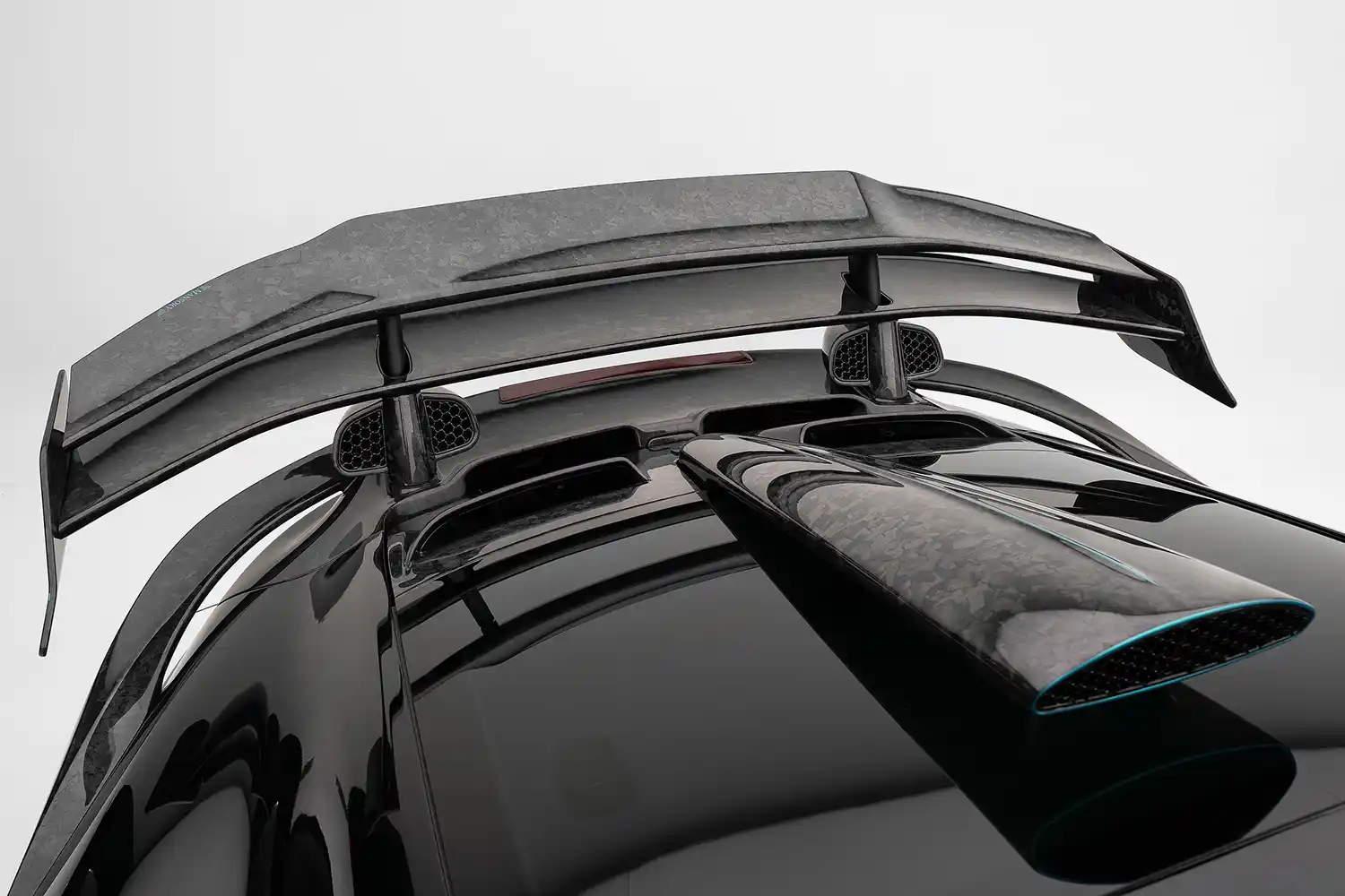 The following components developed by MANSORY engineers are responsible for the performance enhancement: larger VTG turbochargers for each cylinder bank, 98 mm downpipes with exhaust flaps, a water-cooled intercooler with adapted fan control, a completely new high-performance exhaust system, a sports air filter and a complete reprogramming of the engine control unit (ECU).