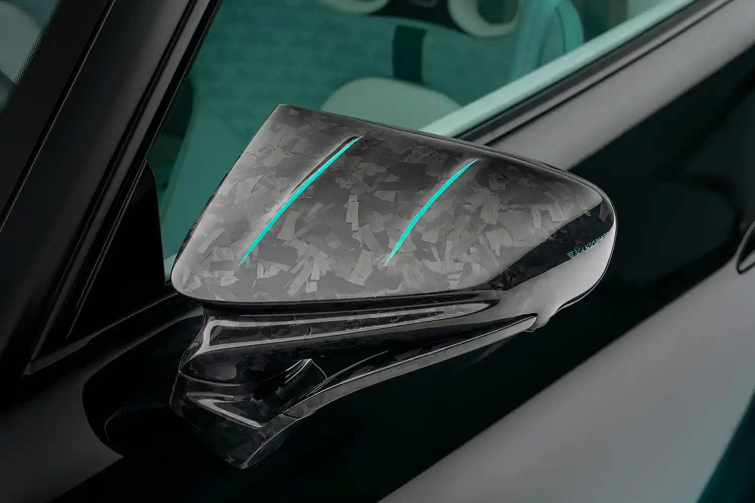 The front bonnet of the “P9LM EVO 900” is completely finished in visible carbon and finds its visual continuation in the upper part of the apron (also finished in visible carbon). In the side view, striking sills show the unmistakable signature of MANSORY. Ventilation outlets for the wheel arches integrated into the top of the wings and body extensions on the wheel arches all around, also manufactured in visible carbon, complete the imposing appearance of the “P9LM EVO 900” from the side and bear witness to its origins in motorsport and the desire to optimise aerodynamics.