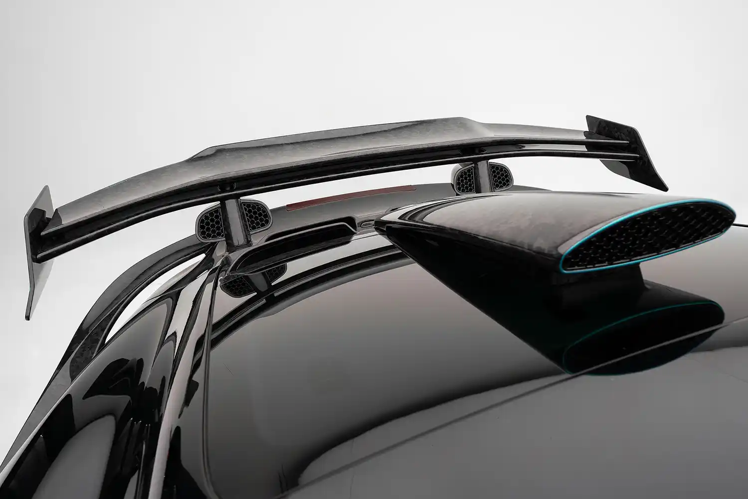 The newly developed diffuser is responsible for perfect guidance of the airflow underneath the vehicle and, for increased downforce on the rear axle, the large retractable rear spoiler, also completely new, in cooperation with the rear apron, which has also been redesigned and generates additional downforce. The rear apron as such is partly painted and partly finished in visible carbon.
