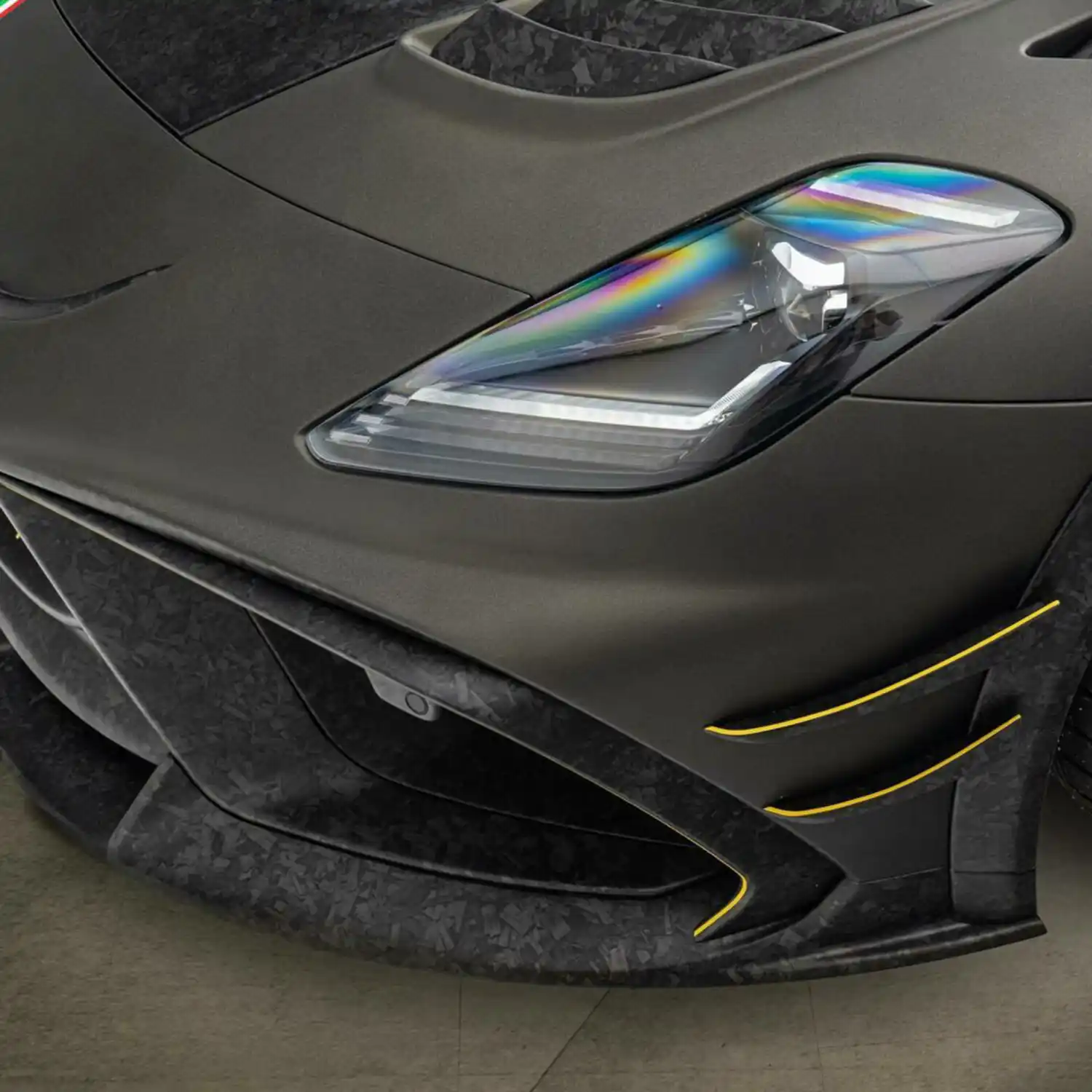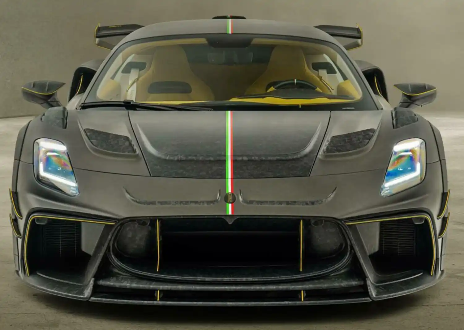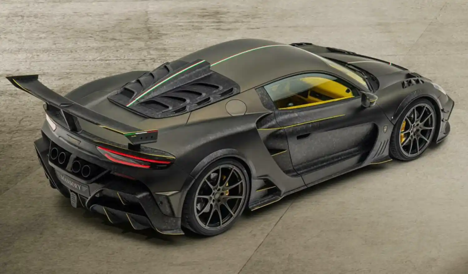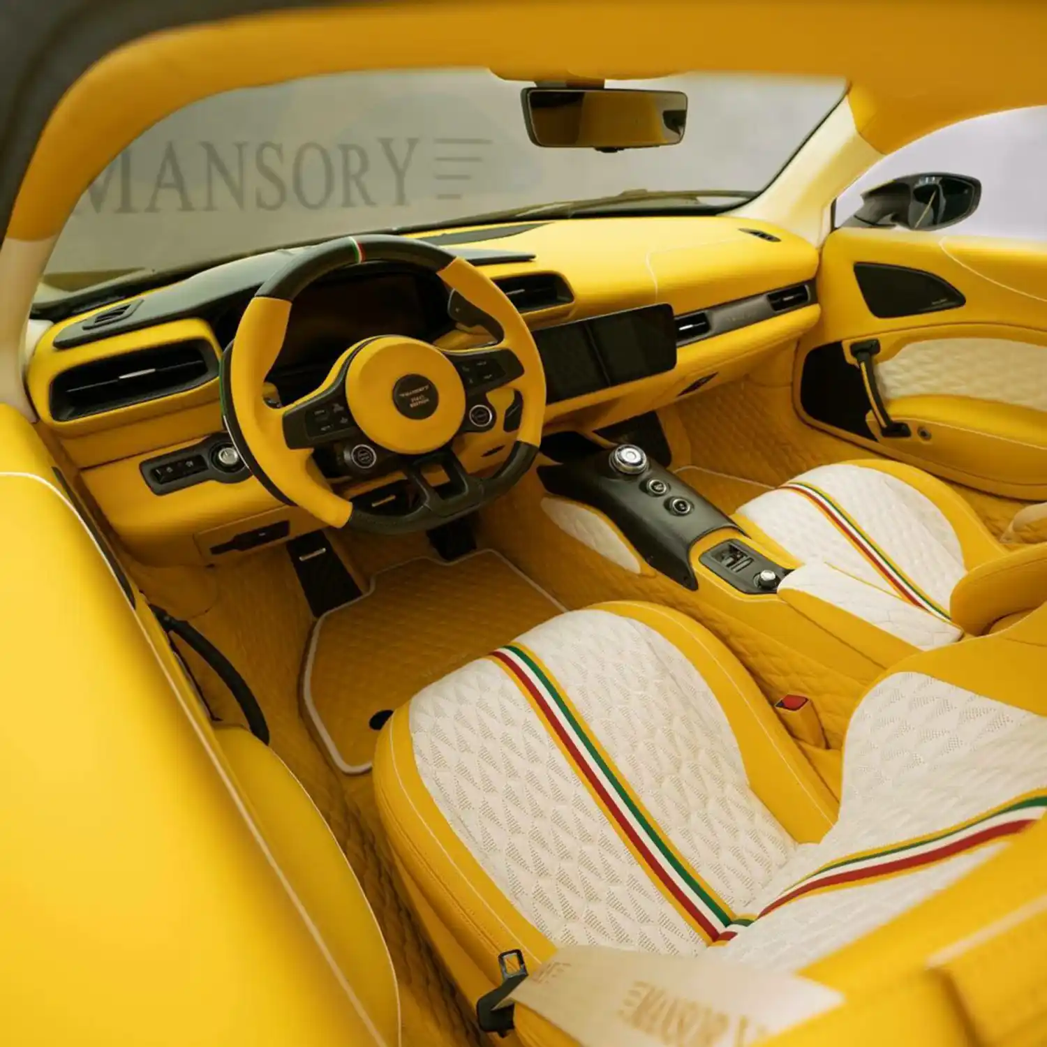 The interior of the “MANSORY FIRST EDITION” is in principle – likewise the exterior colours of all complete conversions – freely selectable and configurable by the customer. In the case of the vehicle shown here, the complete interior was kept in the three colour tones yellow, white and black. The national colours of Italy are reflected in the form of a central stripe in the sports seats and the headliner. In the same way, the car itself is discreetly and centrally divided by a small painted stripe in green, white and red.