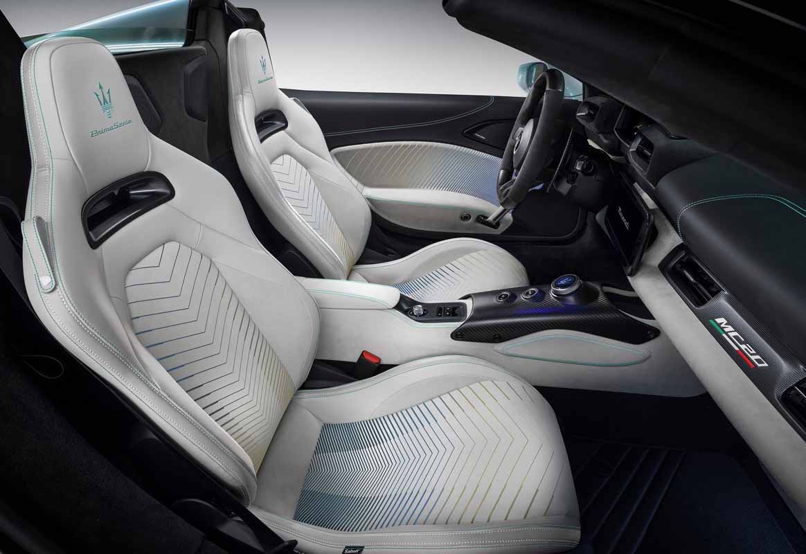 The interior of the Maserati MC20 Cielo follows the same philosophy. In the launch version, light is key, in the use of ice-coloured Alcantara and leather. Below the dashboard, the ice-coloured door panels and seats enhance the finishes and contribute to the visual lightness of the car in comparison to the standard version, which retains a black leather interior. The trident on the headrest can also be embroidered by hand as an optional extra.