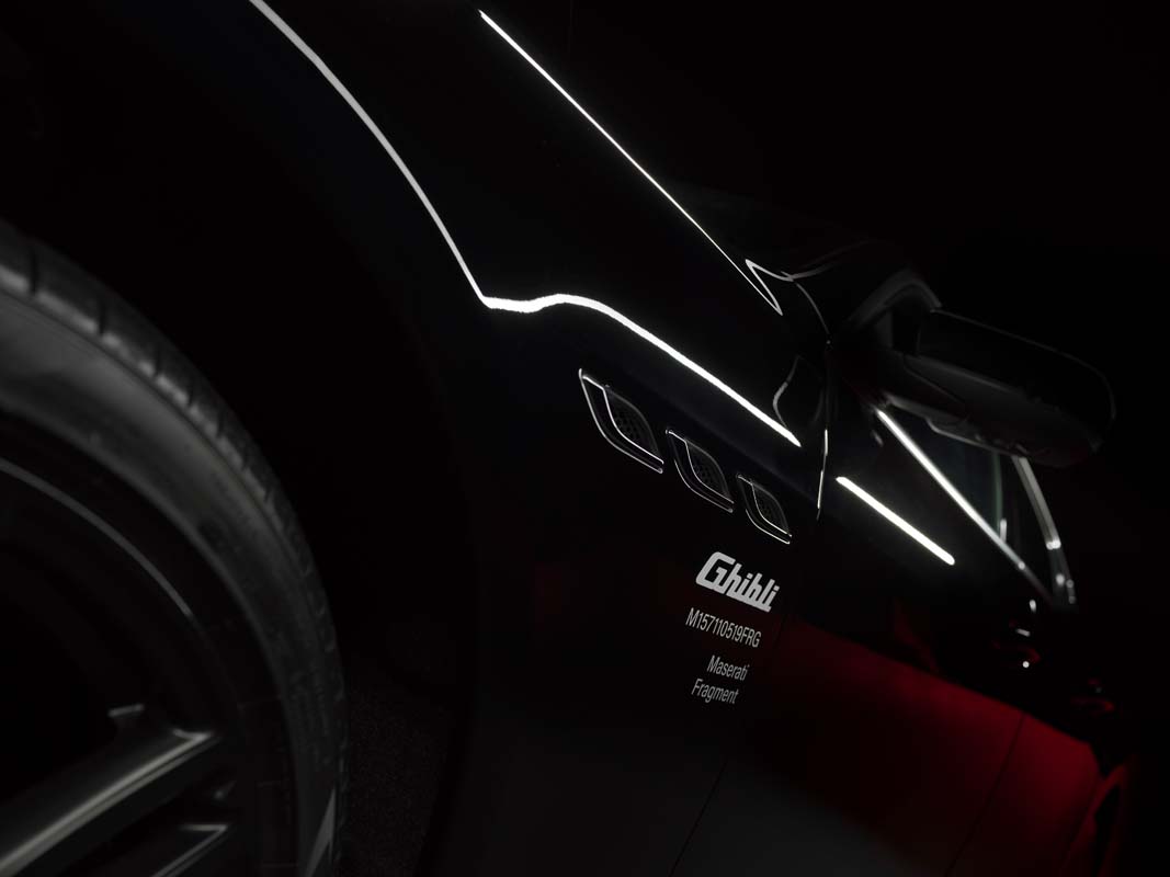 Last but not least, the code M157110519FRG appears underneath the three iconic side air ducts. This alphanumeric tag seals the partnership: the first four characters are the Ghibli ID code, the next six numbers record the date of the first meeting (5 November 2019) between Hiroshi and the Centro Stile Maserati, and the final three letters are the acronym of Fragment.