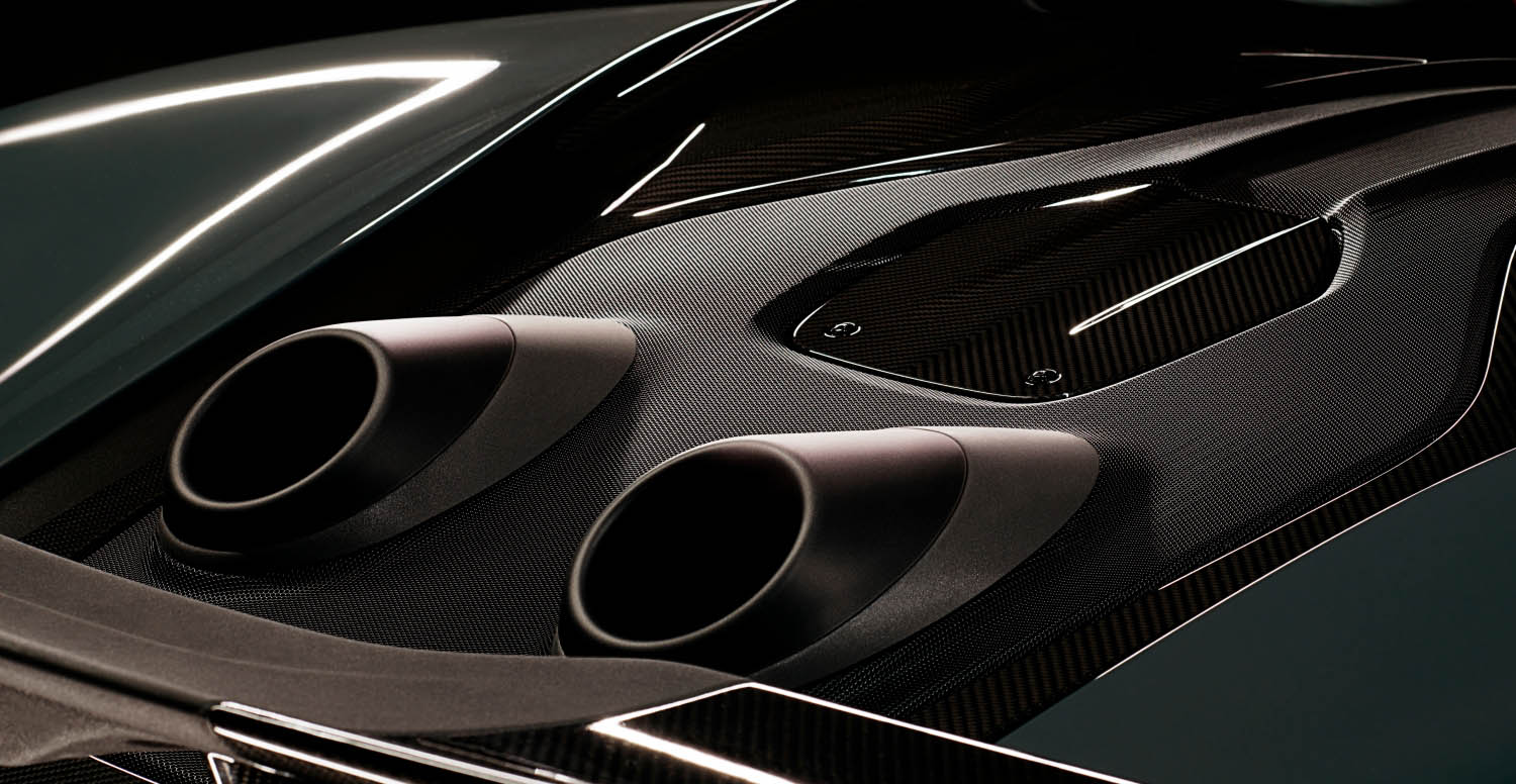 Crafted in stainless steel, the exhausts exit through the rear deck to create a unique aesthetic but there are inherent advantages beyond this. Work to hone the aerodynamics and heat management in conjunction with the fixed rear wing unlocked other benefits ranging from weight reduction and improved powertrain response to enhanced engine bay cooling and the packaging improvements that made possible the larger rear diffuser and new Rear Bumper Aero Fins.