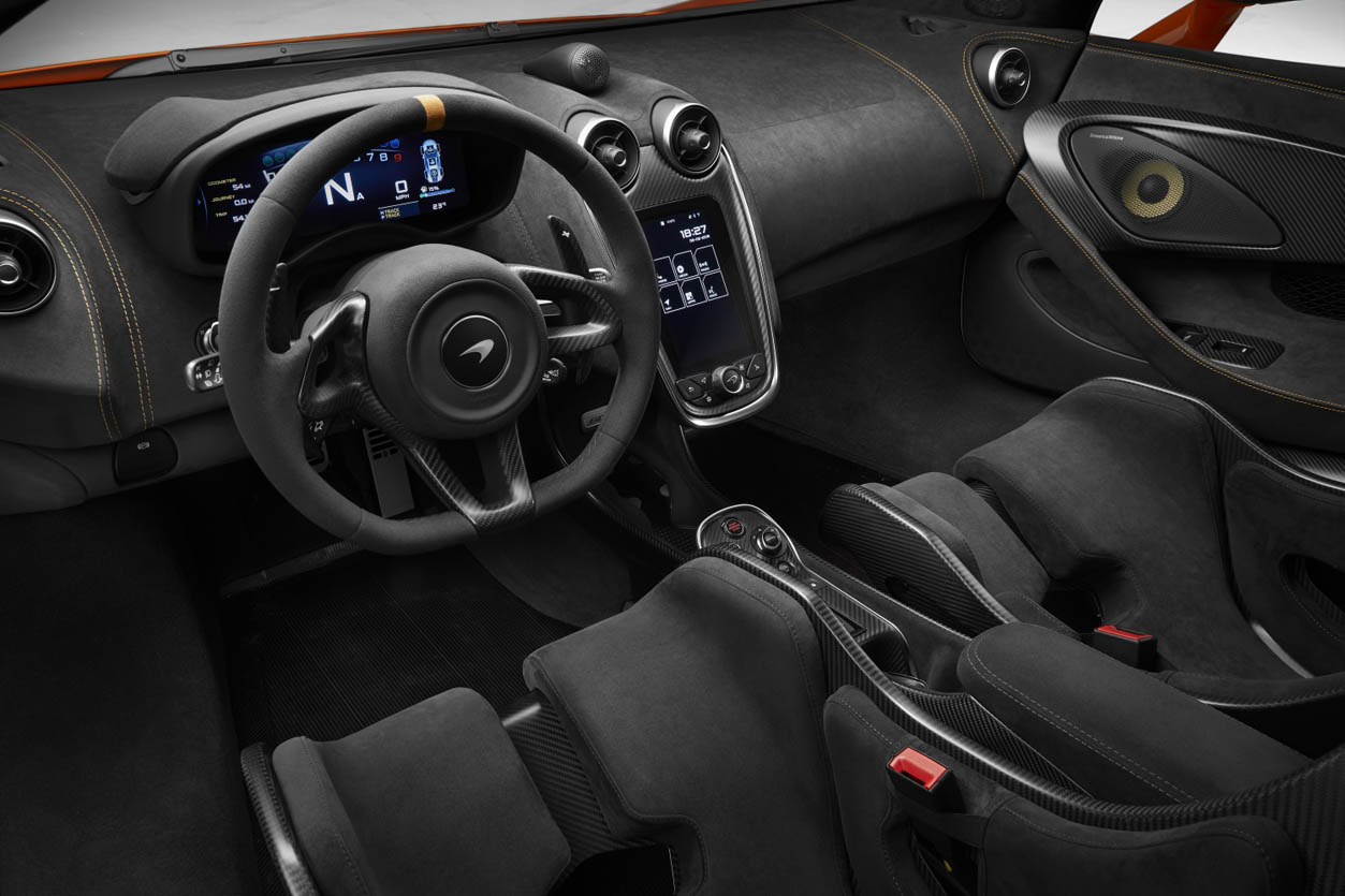 Owners intending to spend time on a track or who want to visually enhance their car while also saving weight over the standard specification, can option the MSO Clubsport Pack from McLaren Special Operations. Exterior enhancements in the pack comprise Carbon Fibre Roof and Cantrails; Carbon Fibre Flying Buttresses; Carbon Fibre Front Fender Louvres; and Titanium Wheel Bolts. Inside the car, Super-Lightweight Carbon Fibre Racing Seats from the McLaren Senna feature together with a carbon fibre interior upgrade pack of extended gearshift paddles and steering wheel spokes and switch and IRIS display surrounds, all in the lightweight materials. The MSO Clubsport Pack, which reduces weight by 9.3kg in total, is available at point of order for £24,170.