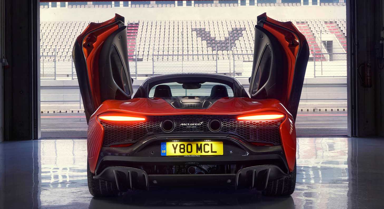 The central-exit exhausts are set between the two light blades. Positioned high within the centre of the rear mesh, the twin tailpipes exit straight out from the engine’s ‘hot vee’, having passed through the catalysts and gasoline particulate filters (GPFs). Positioning the exhausts this high allows for the Artura’s full-width, dual-level diffuser, which functions by the expansion of air across its full span, especially at the outboard corners.