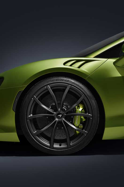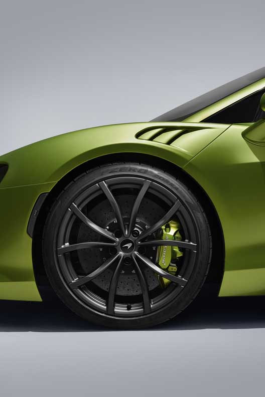 In addition to the discs and forged aluminium calipers (6-piston front monobloc, 4-piston rear), the Artura adopts a version of the Formula 1-inspired integrated caliper cooling ducts seen on the 765LT. This technology delivers cooling air to the front calipers and discs, reducing brake pad temperatures during track driving.