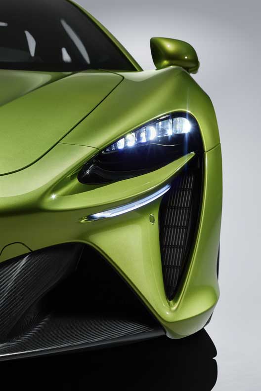The Artura has perfect supercar proportions – a long, low sleek nose, long roofline, very fast windscreen angle and very ‘cab-forward’ stance. Coupled with a compact wheelbase, 19-inch and 20-inch wheels and high fenders and haunches, the result is a superb dynamic feel overall, enhanced by the extremely compact rear overhang.