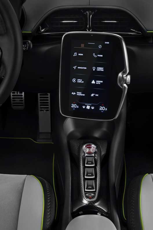 The interior design has been driven by the same principles of purity, technical sculpture and functional jewellery that dictated the exterior of the Artura; the upper facia rises up to meet the wide and deep windscreen, which is bordered by a carbon fibre structure that ensures particularly slim A-pillars; the facia seems to almost float, creating a sense of calm focus with no visual interruptions in the driver’s eyeline and complementing the unmatched visibility.