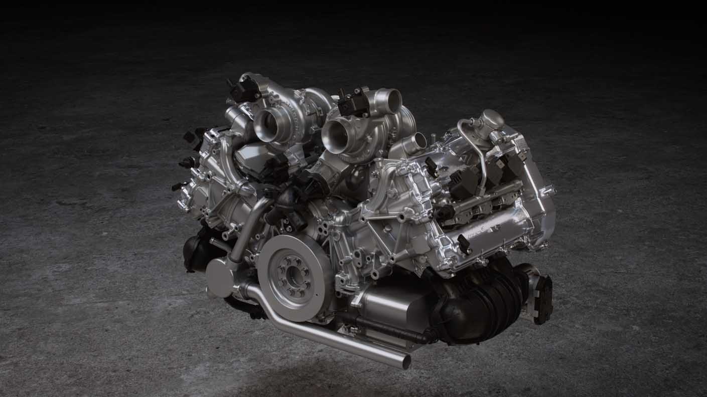 Designed to run with a Gasoline Particulate Filter to optimise emissions performance, the M630 engine is also extremely refined. The 120° v-angle of the engine, which allows the turbochargers to be positioned within the ‘hot vee’, delivers further advantages in packaging as well as contributing to a lower centre of gravity. The 120° layout increases engine performance by reducing the pressure losses through the exhaust system and allows for a stiffer crankshaft that enables a rev limit of 8,500rpm, maximising performance and driver engagement.