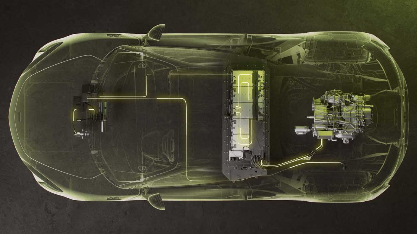 The battery pack consists of five lithium-ion modules, which sit on a cooling manifold. The battery management unit sits alongside the modules, and the power distribution unit (PDU) is integrated into the battery to save space. The battery is indirectly cooled via refrigerant in the cooling rails of the manifold; the refrigerant circuit runs from the front of the monocoque where the new electric heating, ventilation and air conditioning system is located. Optimised cooling of the battery delivers greater power and supports consistency of the zero-emissions range.