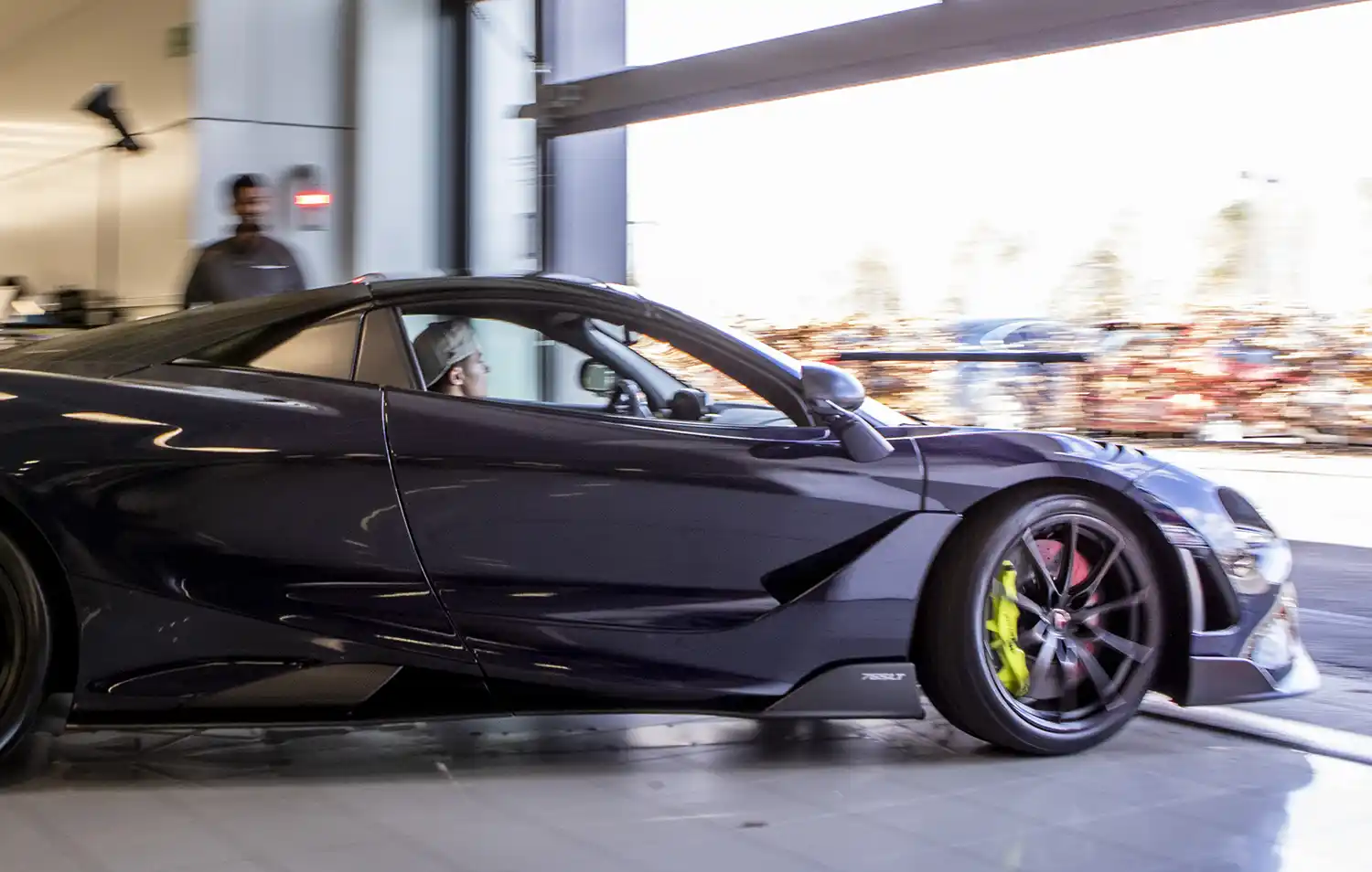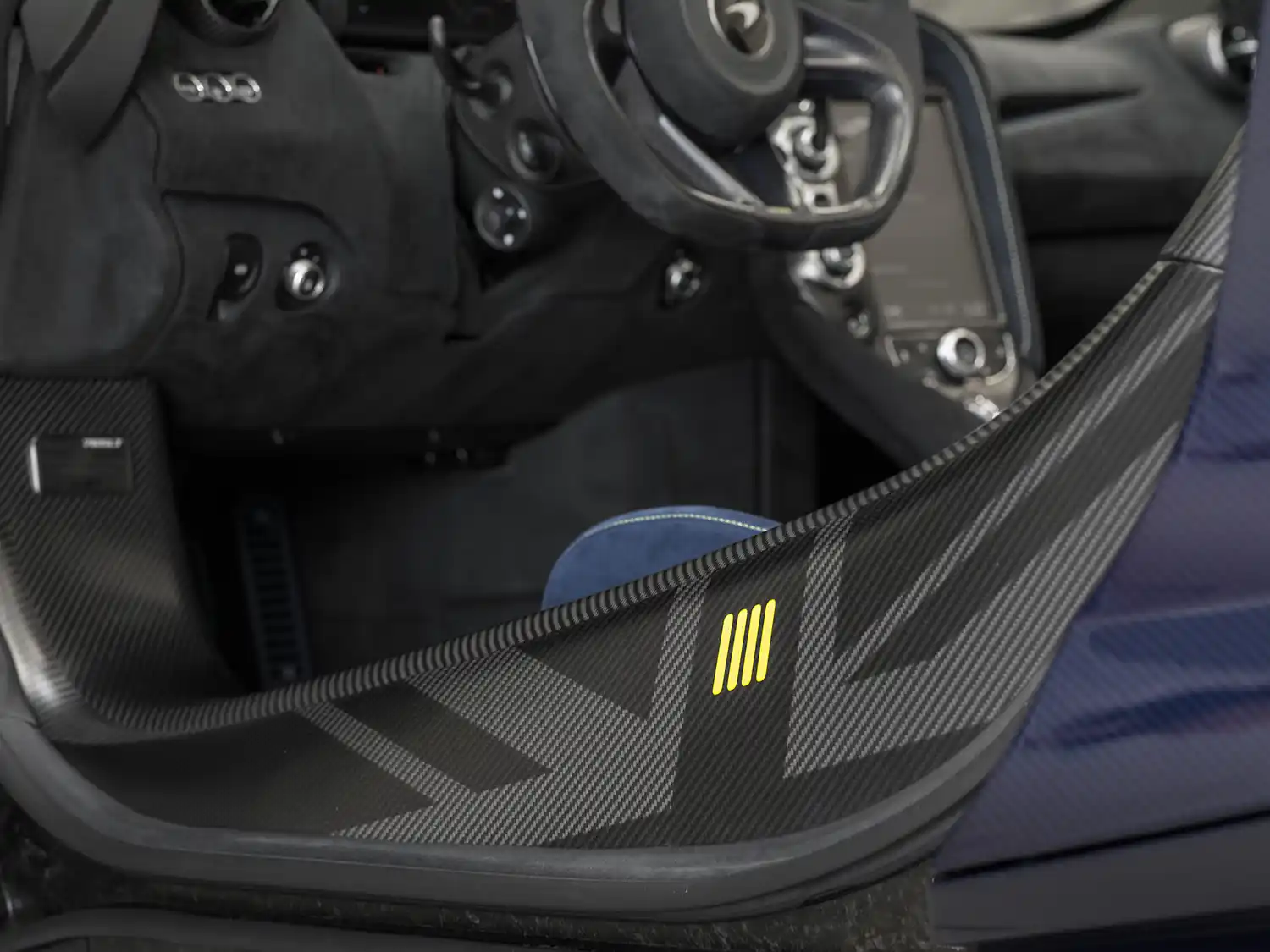 The distinctive exterior finish of Lando’s 765LT is complemented by Satin Black wheels and is contrasted by Lando Yellow brake calipers, the same colour used for Lando’s own four stripe Graphic – reflecting his race number – which appears above the right-side eye socket and under the active rear wing, the latter feature visible only during high-downforce deployment. The wing also features MSO branding in Gloss Blue Tint Visual Carbon Fibre on a Satin Carbon Fibre insert on its upper surface.