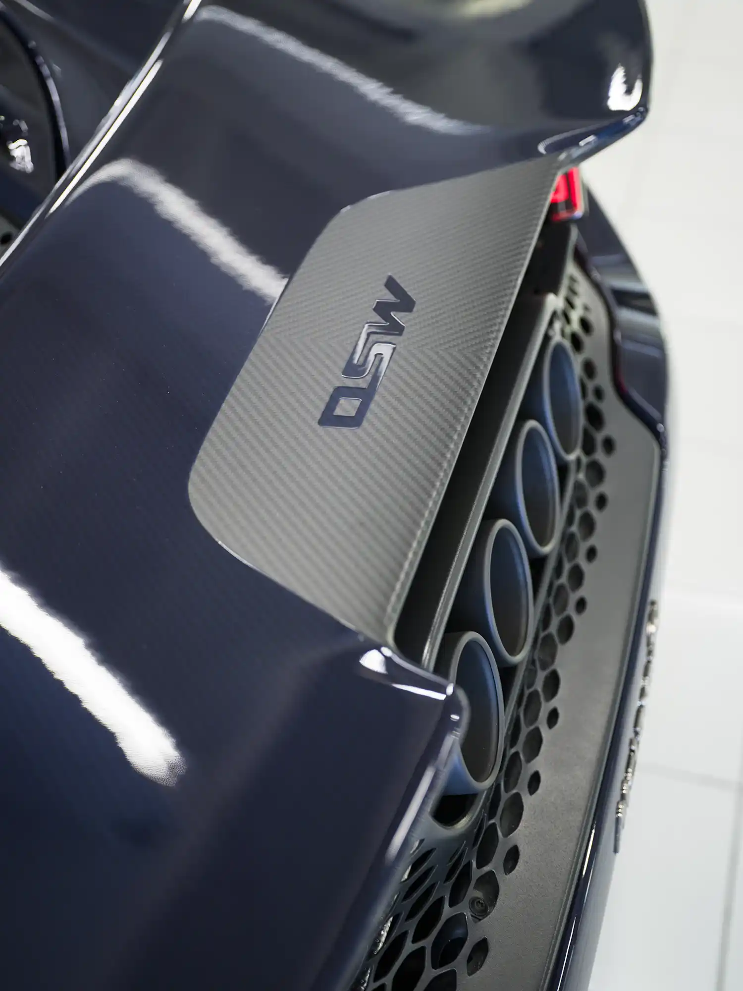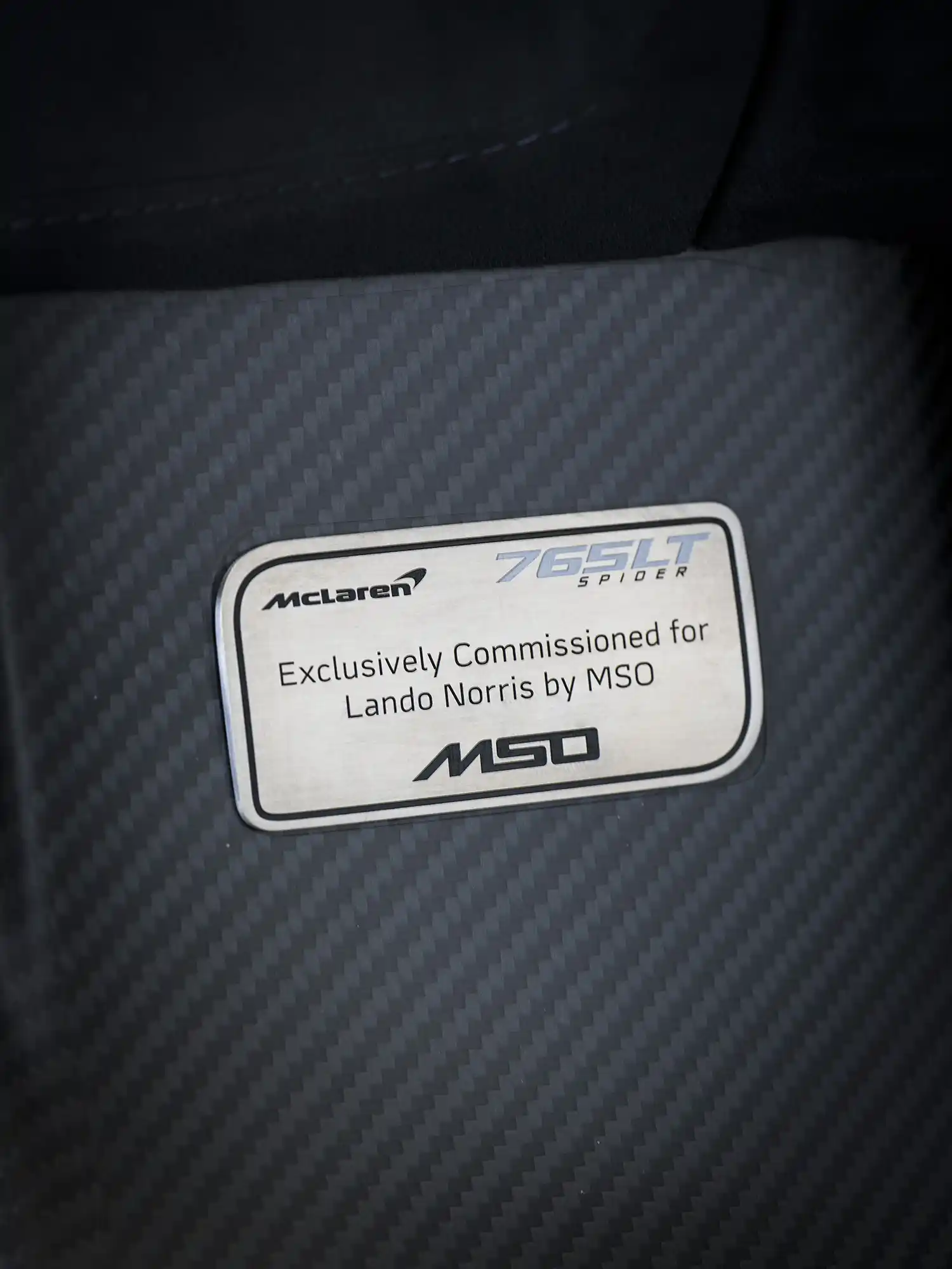 There are additional hidden interior features, most noticeably the MSO Custom Dark Tint Carbon Union Flag Sill with Lando Graphic visible when opening the doors. Below the MSO Custom Steering Wheel with Blue Tint Carbon Fade, 12 O’Clock Marker in white and Lando Yellow Lando Graphic, is the MSO Custom Floor Mat – repeated on the passenger side – with LN4 branding and Napier Stitching, placed ahead of Blue Anodised Pedals. The distractive interior is completed with a unique MSO Dedication Plaque confirming the exclusive commission by Lando.