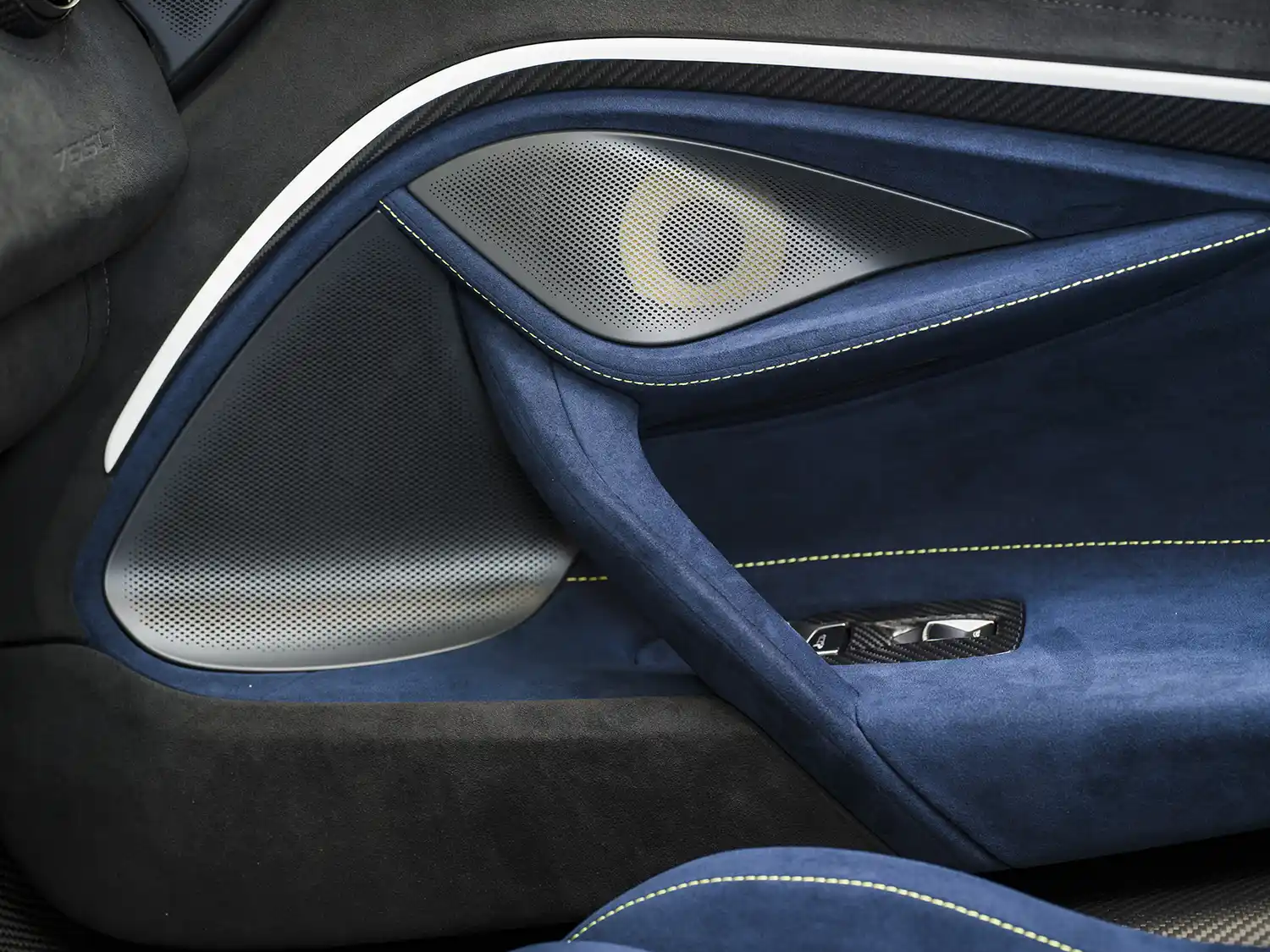 The interior continues Lando’s colour scheme, which is visible from the outside when the Retractable Hard Top – featuring a glass Electrochromic Roof – is lowered. The Carbon Fibre Racing Seats are trimmed in Navy Blue with Napier Stitching. In addition, the head rests are embroidered with Lando’s personal initial ‘LN4’ branding. There are also Navy Blue Alcantara and Napier Stitching highlights on the door and dash trim and the door appliques have a painted white pinstripe.