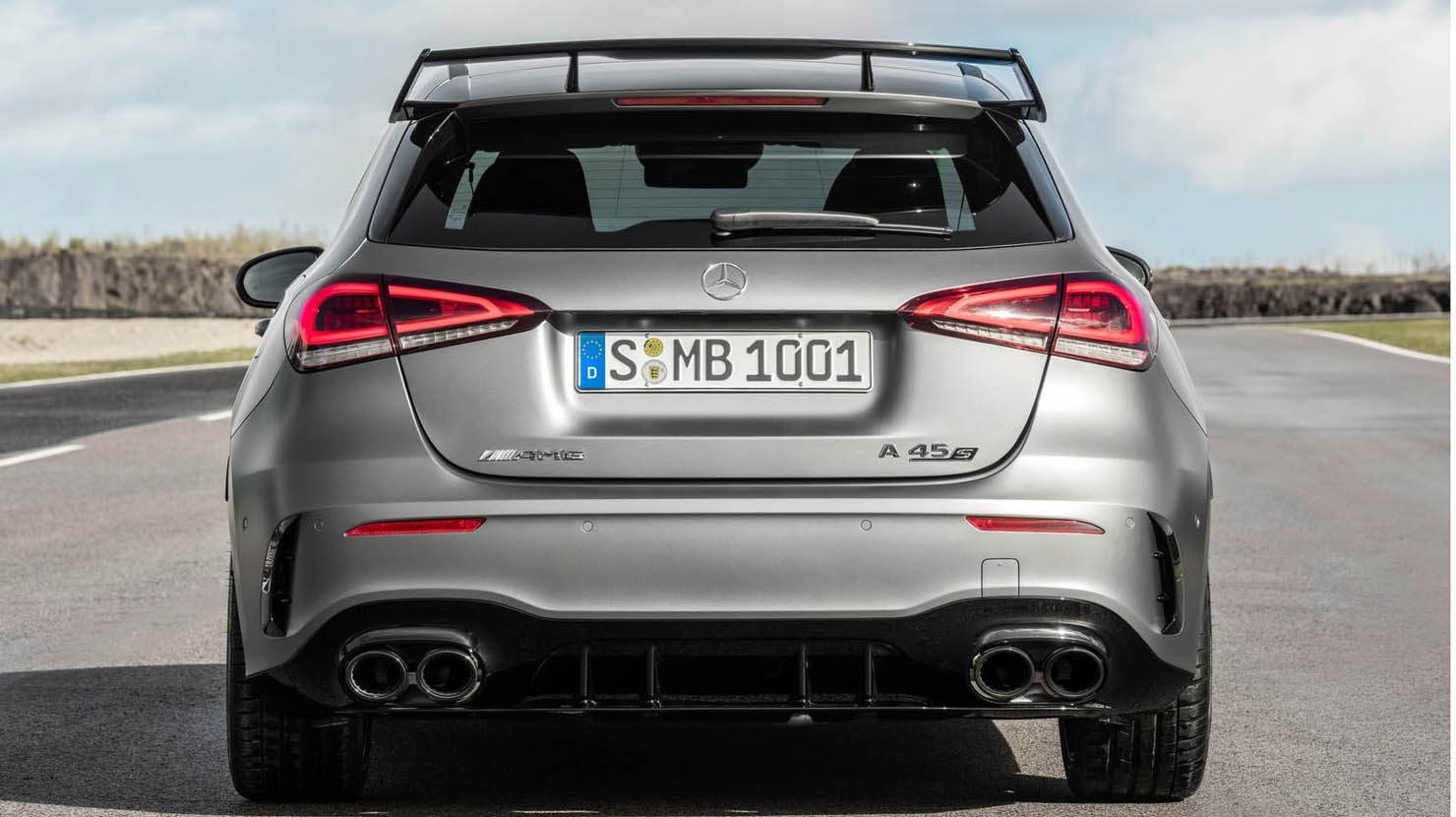 The rear view is characterised by two round twin tailpipes (82 mm diameter) and the wide rear apron. The S-models are distinguished by their larger, 90 mm exhaust tailpipes with internal fluting and AMG lettering. The impression of width at the rear is emphasised further by the slim two-piece rear light clusters. The diffuser with two vertical twin fins contributes to better aero-performance (CLA45: four individual fins) – it is extended forward at the centre of the vehicle, making it work more effectively. The effect is rounded off by the spoiler lip in the vehicle colour on the roof spoiler, or on the boot lid (CLA45).