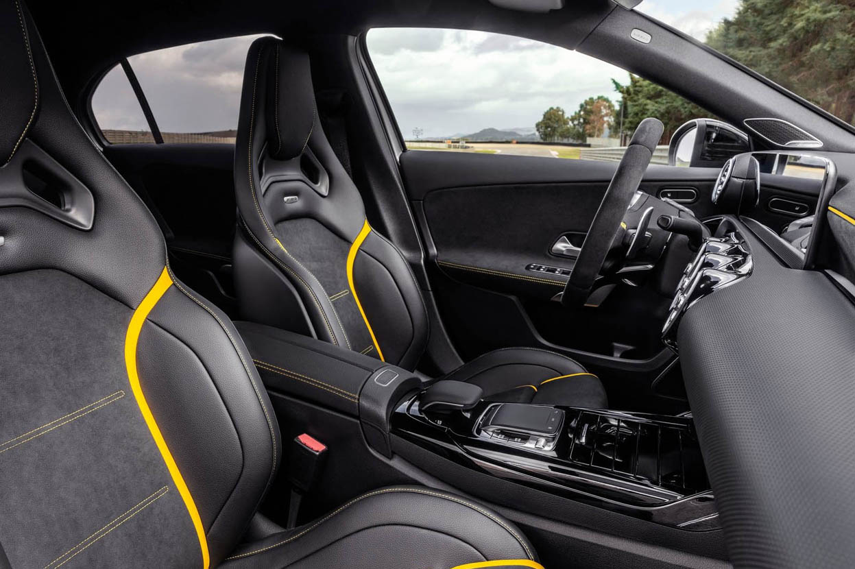 The A45 S and CLA45 S even go a step further: yellow highlights reoccur throughout the interior to emphasise the motor racing character of the more powerful models. Also included in the standard equipment are the AMG Performance steering wheel in nappa leather/DINAMICA microfibre with contrasting yellow topstitching, a yellow 12 o’clock marking, AMG steering wheel buttons and AMG logo, plus ambience lighting.