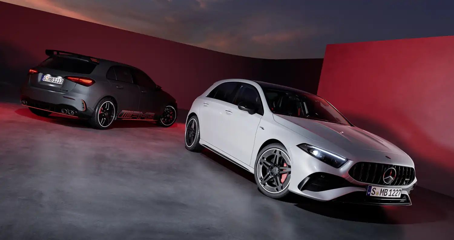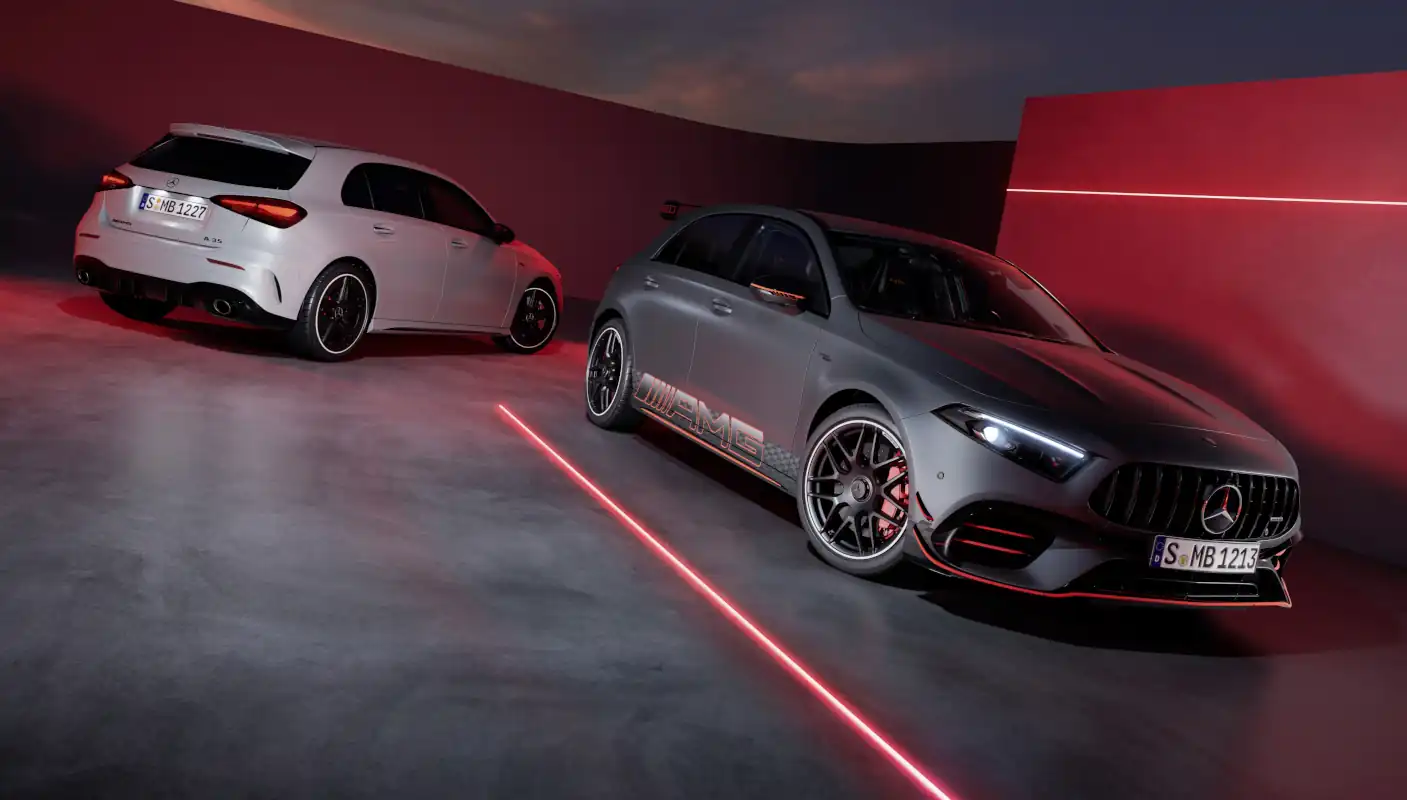Power and style in a compact format – the new A-Class also makes its debut at Mercedes‑AMG and thus forms the sporty top end of the model series. The top model Mercedes‑AMG A 45 S 4MATIC+ (fuel consumption combined 9.2‑8.8 l/100 km, CO2 emissions combined 208‑200 g/km)2 and especially the Mercedes‑AMG A 35 4MATIC (Hatchback fuel consumption combined 8.6-8.2 l/100 km, CO2 emissions combined 196‑188g/km; Saloon fuel consumption combined 8.5‑8.1 l/100 km, CO2 emissions combined 192‑184g/km)2 benefit from the refresh from Affalterbach. With its revised look, the A 35 moves even closer to the AMG family and is still available as a Hatchback and as a Saloon, while the A 45 S is available as a Hatchback as before.