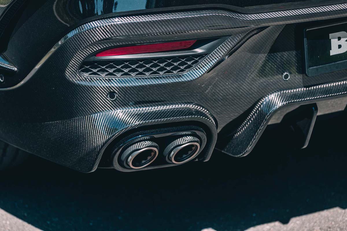 The BRABUS diffuser insert enhances the rear end. It blends precisely into the rear bumper and features tailor-made cutouts on the left and right for the tailpipes of the BRABUS sport exhaust system. The carbon trim for the side air outlets in the rear fascia add further sporty touches. The three-piece BRABUS rear spoiler in tandem with the BRABUS exposed-carbon wheel arch extensions rounds off the thrilling design. They replace the production components at the front and rear axle.