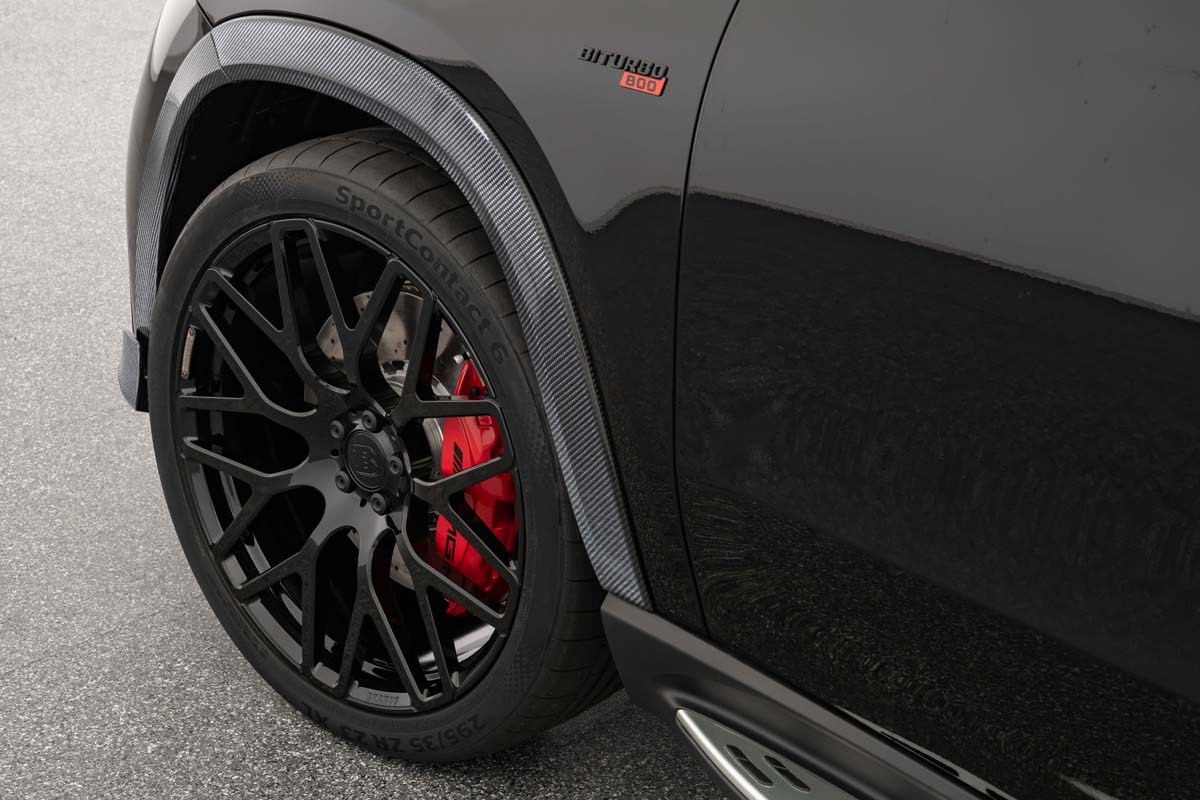 Exposed-carbon aerodynamic-enhancement components with sporty and elegant styling in concert with tailor-made BRABUS wheels including king-sized 24 inches in diameter give the all-wheel fastback a particularly exclusive appearance.