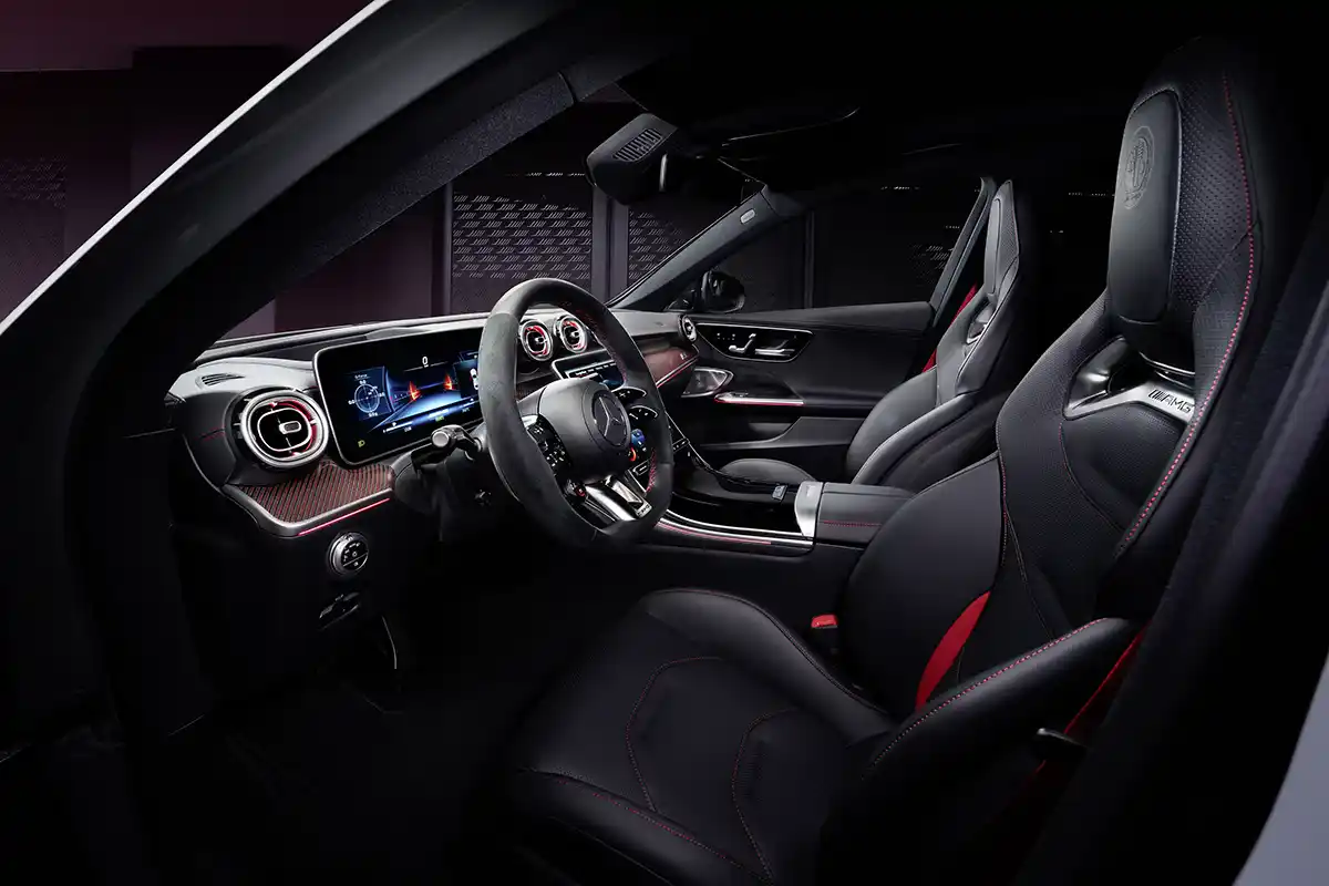 The interior is characterised by the contrast of black and red. The AMG Performance seats are particularly refined with upholstery in Exclusive black nappa leather with red decorative topstitching and embossed AMG emblems in the front head restraints. They follow the sporty look just like the seat belts in red and the exclusive AMG carbon trim elements with red thread. The AMG Performance steering wheel in nappa leather / DINAMICA microfibre with red decorative topstitching and the AMG door sill trims with red illuminated “AMG” lettering are a perfect match. The finishing touches are the exclusive Edition badge in the interior and specific AMG floor mats with red decorative topstitching and F1 logo.