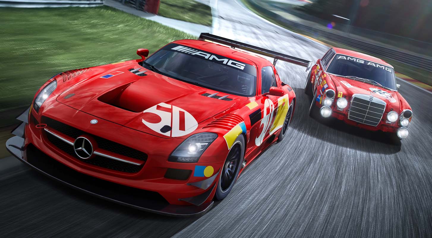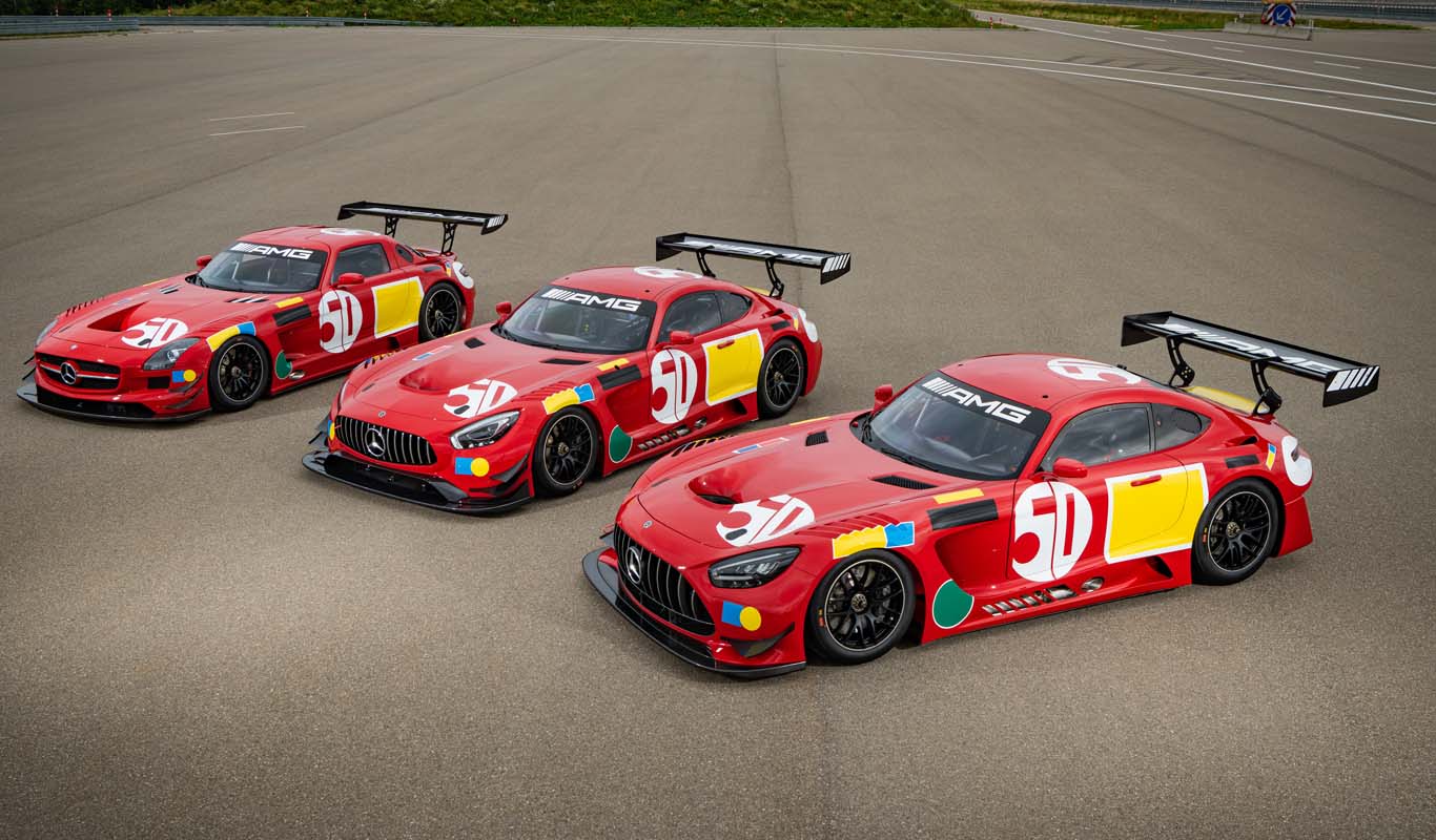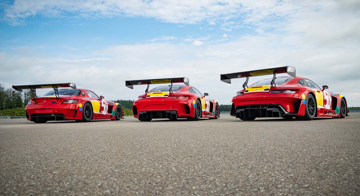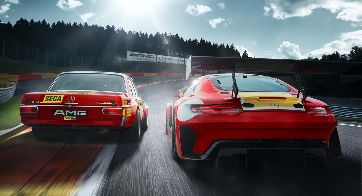The limited edition consists of one Mercedes-Benz SLS AMG GT3, one Mercedes-AMG GT3 (model year 2016) and the current evolution version of the Mercedes-AMG GT3. All three race cars are ready-to-race one-offs with special characteristics and unique features. Characteristic is the livery that recalls the iconic looks of the 300 SEL 6.8 AMG from 50 years ago. Next to the red basic colour, the surfaces for starting numbers and sponsors have been unmistakably inspired by the race participation at Spa at the time.