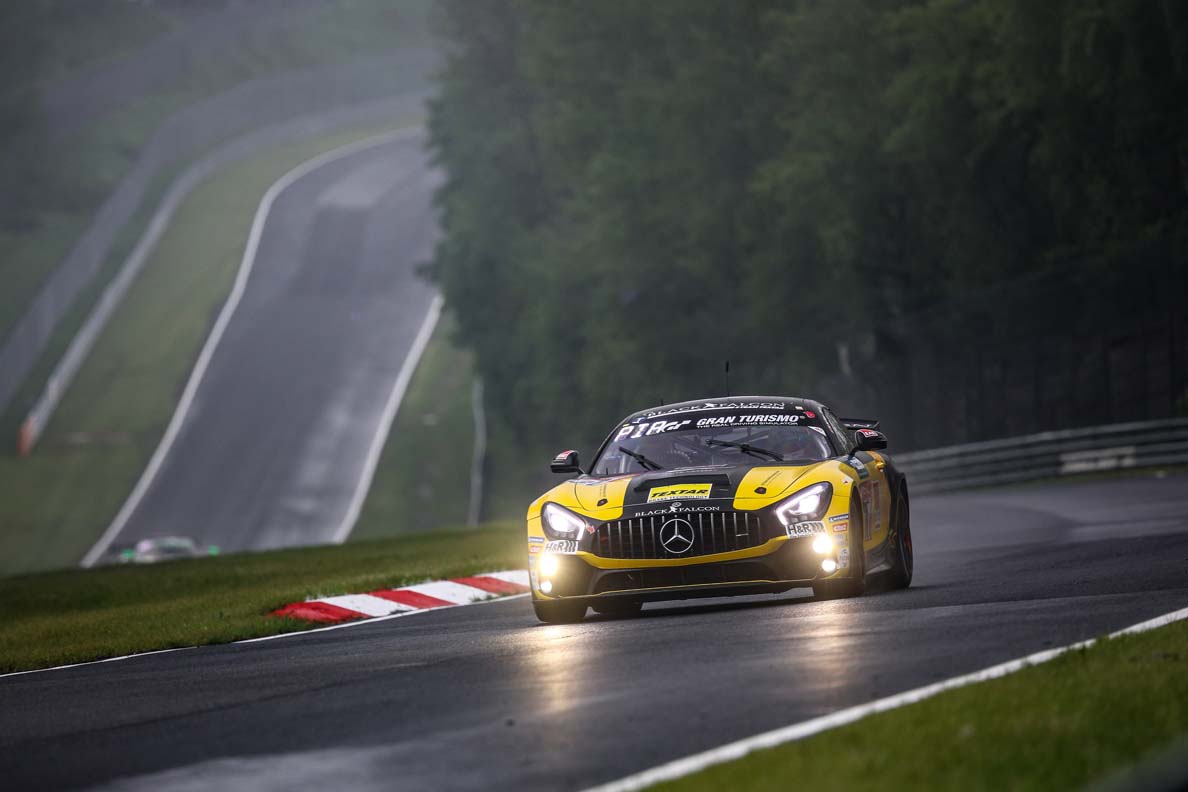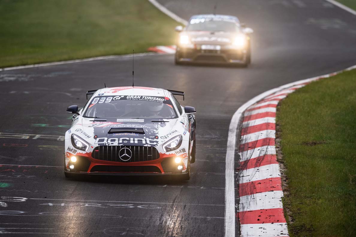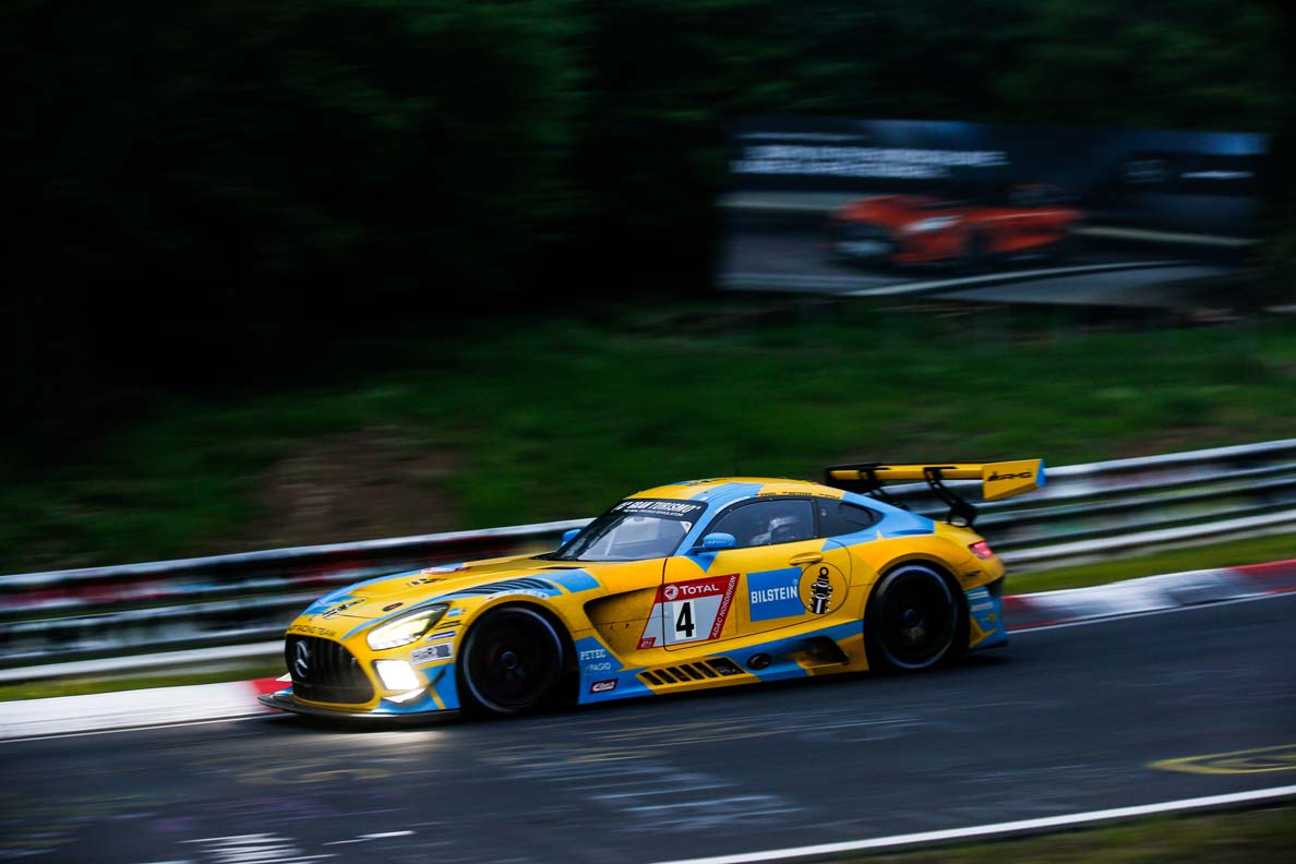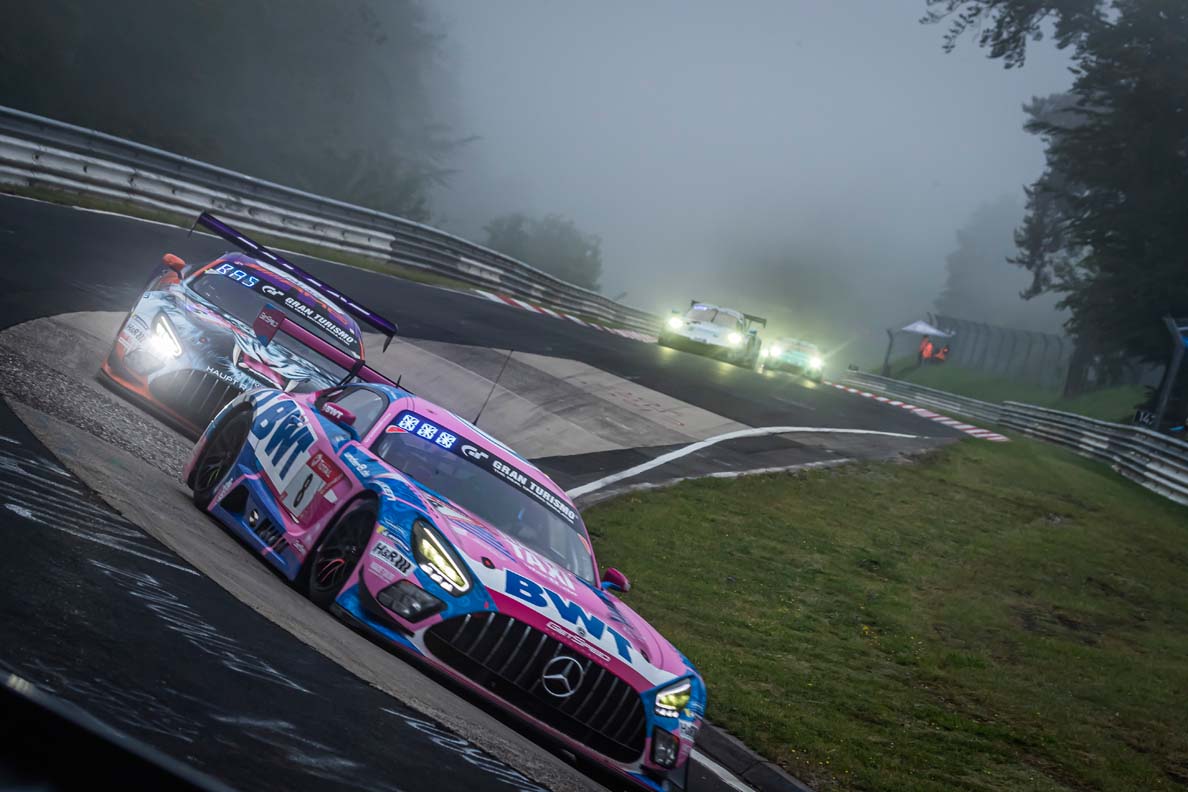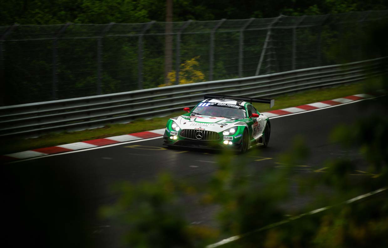 Like in the previous year, extreme weather conditions made their mark on the 49th running of the classic endurance race. In the opening stages, heavy downpours considerably mixed up the field of the favourites. From the four Mercedes-AMG GT3s that had started among the first seven, only the #4 Mercedes-AMG Team HRT car managed to maintain its position up front. The car with Adam Christodoulou (GBR), Maro Engel, Manuel Metzger and Luca Stolz (all GER) as its drivers racked up the most laps in the lead in this stage of the race. As darkness fell, the Eifel circuit got covered in thick fog, leading to an interruption of the race at 9.30pm. Until the red flag was out, four further Mercedes-AMG GT3s managed to stay on the lead lap next to the #4 car.